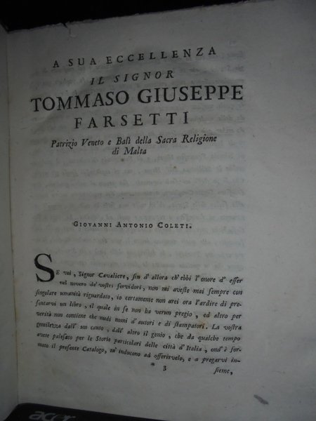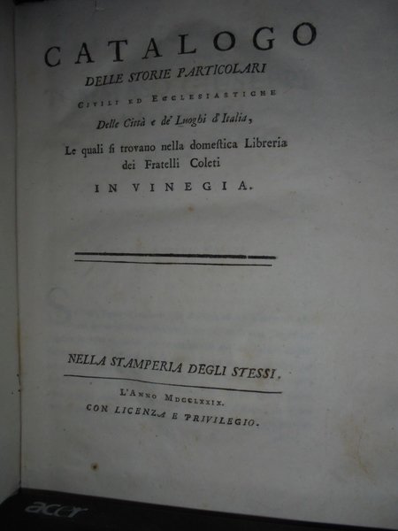 CATALOGO DELLE STORIE PARTICOLARI CIVILI ED ECCLESIASTICHE DELLE CITTÀ E DE' LUOGHI D'ITALIA, LE QUALI SI TROVANO NELLA DOMESTICA LIBRERIA DEI FRATELLI COLETI IN VINEGIA
