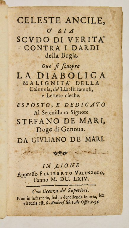 Celeste ancile ò sia scudo di verità contra i dardi della bugia. Ove si scuopre la diabolica malignità della calunnia, de' libelli famosi, e Lettere cieche.