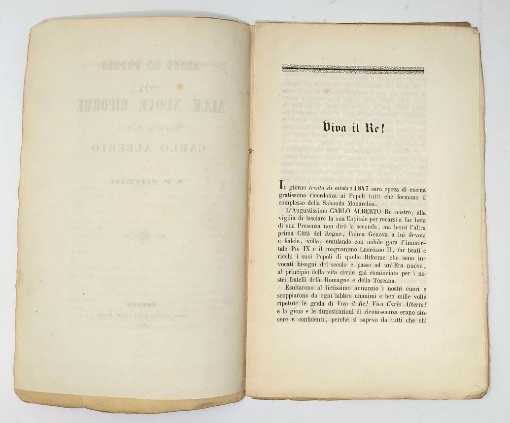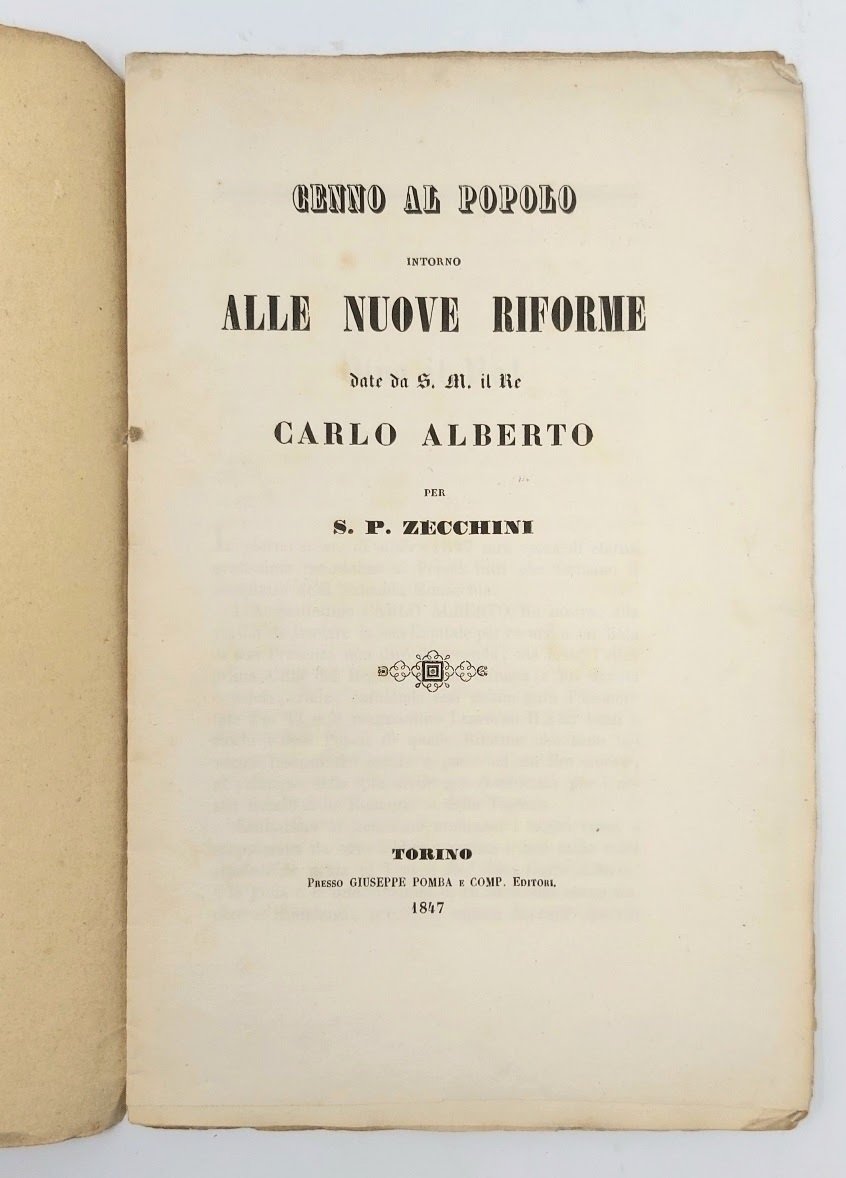 >in-8 (220x135 mm), pp. 16, brossura in carta muta coeva d'attesa. Prima ed unica edizione. L'autore fu lessicografo e giornalista, noto principalmente per il suo Dizionario della lingua italiana, pubblicato nel 1861. Rarissimo pamphlet dato alle stampe negli ultimi mesi del 1847, dopo che i moti di protesta spinsero Carlo Alberto alle prime riforme (pubblicate il 1 novembre) che avrebbero nei mesi seguenti trovato pieno compimento nello Statuto Albertino. L'Autore ne dà puntuale notizia, lodando in particolar modo le concessioni alla Libertà di Stampa e la riforma della Polizia. Prezioso documento storico contemporaneo all'inizio del processo riformista avviato da Carlo Alberto nell'ottobre del 1847. Buon esemplare.