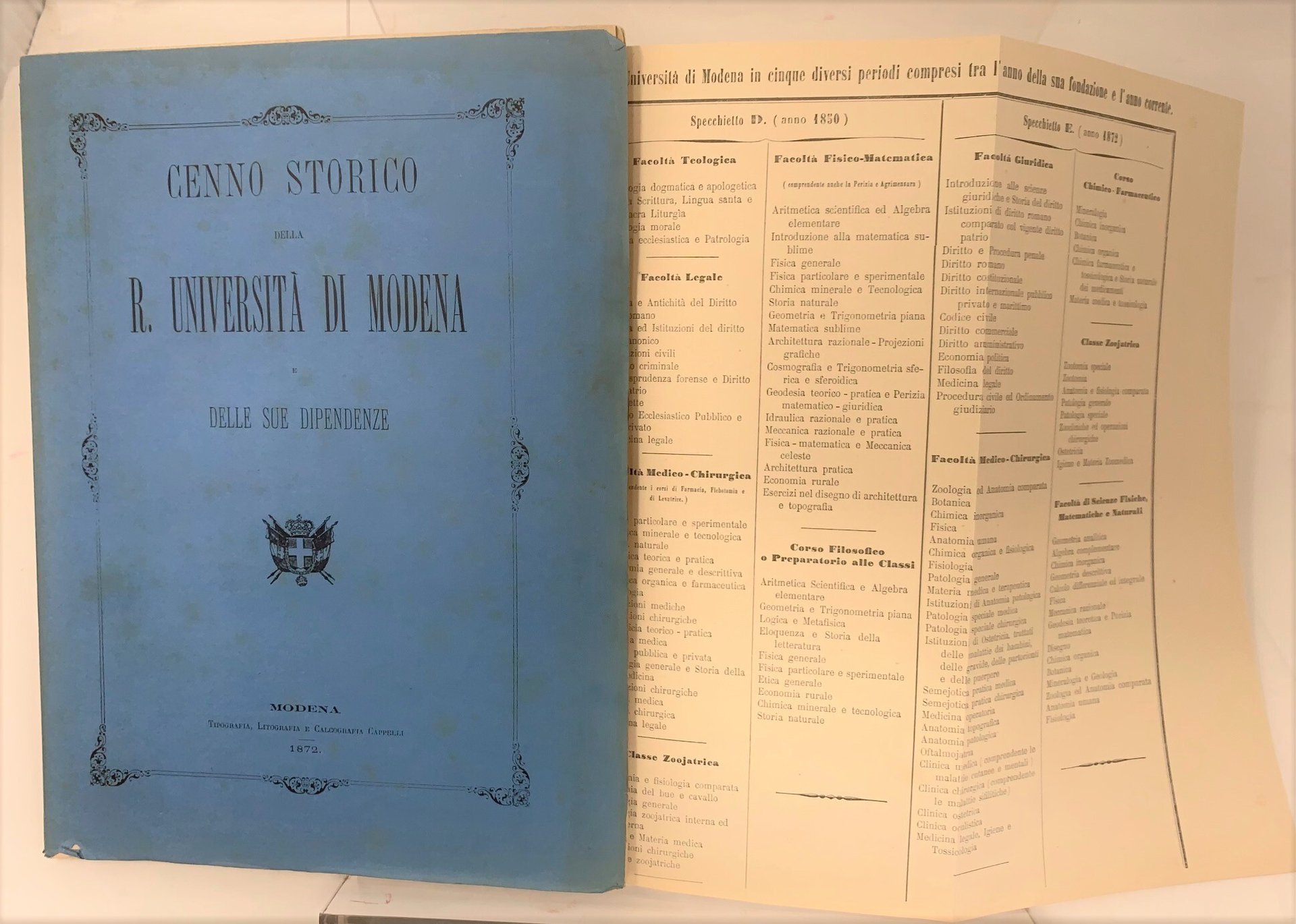 >in-4 (mm 310x235), pp. 65, (1), brossura editoriale figurata. Infine 2 tabelle a stampa ripiegate: "Specchietti comparativi dimostranti la qualità ed il numero degli insegnamenti dell'Università di Modena in cinque diversi periodi compresi tra l'anno della sua fondazione e l'anno corrente"; "Tavola numerica degli Studenti della Regia Università di Modena distribuiti per Facoltà e per anni di studio dell'anno accademico 1814-15 all'anno 1871-72". Luigi Vaccà (Massa 1814-1890), lottò per la difesa dell'Ateneo, contro il pericolo di soppressione, e per l'equiparazione dell'Università di Modena ai maggiori Atenei Italiani. Edizione originale. Esemplare molto fresco.