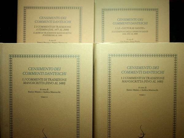 Censimento dei commenti danteschi: 1: I commenti di tradizione manoscritta (fino al 1480); 2: I commenti di tradizione a stampa (dal 1477 al 2000) e altri di tradizione manoscritta posteriori al 1480; 3: Le Lecturae Dantis e le edizioni delle opere di Dante dal 1472 al 2000.