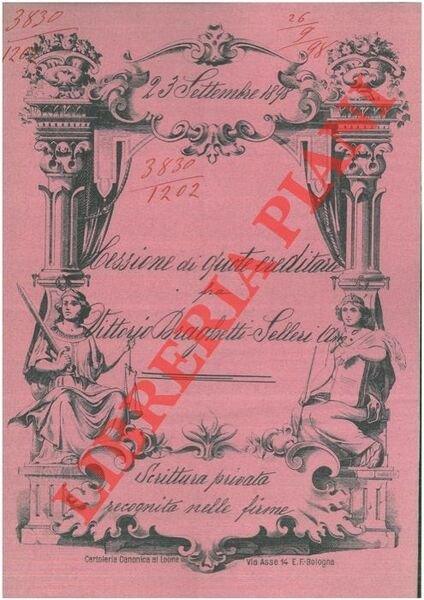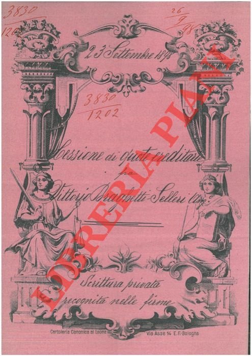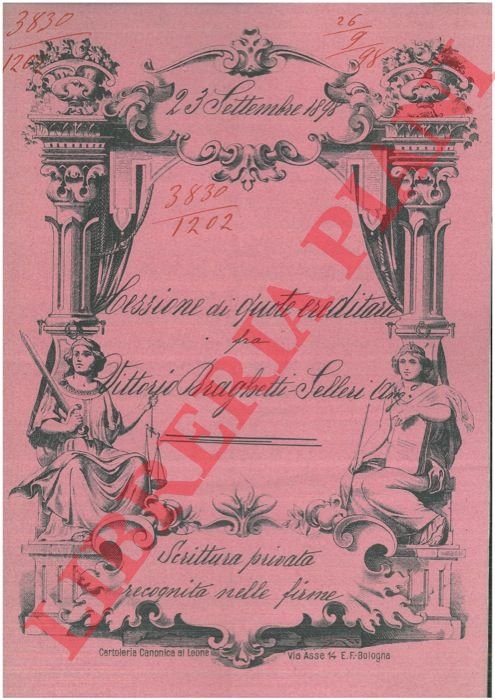 Bologna, 1898, settembre 23, rogito originale di 8 pp. in cartella con bella cornice xilografica, timbro a secco, firma del notaio Daniele Pasi di Bologna