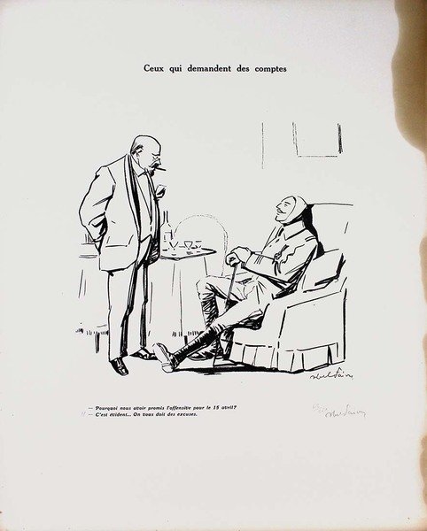 Abel Jules Faivre (Lione 1867 - Nizza 1945) Litografia originale firmata a mano dall'artista.Dimensioni: 56 x 38,5 cmCon certificato di autenticità C.O.A.Ingiallimento laterale come da foto.Esemplare numero 62/250 La raccolta di litografie umoristiche del caricaturista francese Abel Faivre (Lione 1867-Nizza 1945), andata a confluire nel volume Jours de guerre,fu pubblicata in due tomi tra il 1915 e il 1919. Con il procedere del conflitto, l'opinione pubblica di tutti i paesi coinvolti,che aveva dapprima affrontato tale evento con ottimismo, mutò rapidamente opinione sino a considerare la guerra, senza mezzi termini,come un avvenimento rovinoso. In tale contesto, le vignette satiriche di guerra possedevano un potente effetto catartico,adempivano un ruolo sociale irrinunciabile, fornendo una valvola di sfogo all’incombere dal più cupo pessimismo. Abel Jules Faivre (Lyon 1867 - Nizza 1945) Originale Lithographie vom Künstler von Hand signiert.Abmessungen: 56 x 38,5 cmMit Echtheitszertifikat C.O.A.Seitliche Vergilbung wie auf dem Foto.Kopieren Sie die Nummer 62/250 Die Sammlung humorvoller Lithographien des französischen Karikaturisten Abel Faivre (Lyon 1867-Nizza 1945), die in den Band Jours de guerre floss,es wurde zwischen 1915 und 1919 in zwei Bänden veröffentlicht. Im Verlauf des Konflikts wurde die öffentliche Meinung in allen beteiligten LändernWer dieses Ereignis anfangs mit Optimismus konfrontiert hatte, änderte schnell seine Meinung, um den Krieg ohne Zweifel zu betrachten.wie ein ruinöses Ereignis. In diesem Zusammenhang hatten die satirischen Kriegskarikaturen eine starke kathartische Wirkung.Sie erfüllten eine unverzichtbare soziale Rolle und bildeten ein Entlastungsventil gegen den dunkelsten Pessimismus. Abel Jules Faivre (Lyon 1867 - Nice 1945) Lithographie originale signée à la main par l'artiste.Dimensions: 56 x 38,5 cmAvec certificat d'authenticité C.O.A.Jaunissement latéral comme sur la photo.Copie numéro 62/250 La collection de lithographies humoristiques du caricaturiste français Abel Faivre (Lyon 1867-Nice 1945), qui allait se fondre dans le volume Jours de guerre,il a été publié en deux volumes entre 1915 et 1919. À mesure que le conflit progressait, l'opinion publique de tous les pays impliqués,qui avait d'abord fait face à cet événement avec optimisme, a rapidement changé d'avis pour envisager la guerre, en termes non équivoques,comme un événement ruineux. Dans ce contexte, les caricatures de guerre satiriques ont eu un puissant effet cathartique,ils remplissaient un rôle social indispensable, fournissant une soupape de décharge du pessimisme le plus sombre. Abel Jules Faivre (Lyon 1867 - Nice 1945) Original lithograph signed by hand by the artist.Dimensions: 56 x 38.5 cmWith certificate of authenticity C.O.A.Lateral yellowing as in the photo.Copy number 62/250 The collection of humorous lithographs by the French caricaturist Abel Faivre (Lyon 1867-Nice 1945), which went to flow into the volume Jours de guerre,it was published in two volumes between 1915 and 1919. As the conflict progressed, public opinion in all the countries involved,who had initially faced this event with optimism, quickly changed his opinion to consider the war, in no uncertain terms,like a ruinous event. In this context, the satirical war cartoons had a powerful cathartic effect,they fulfilled an indispensable social role, providing a relief valve from the darkest pessimism.