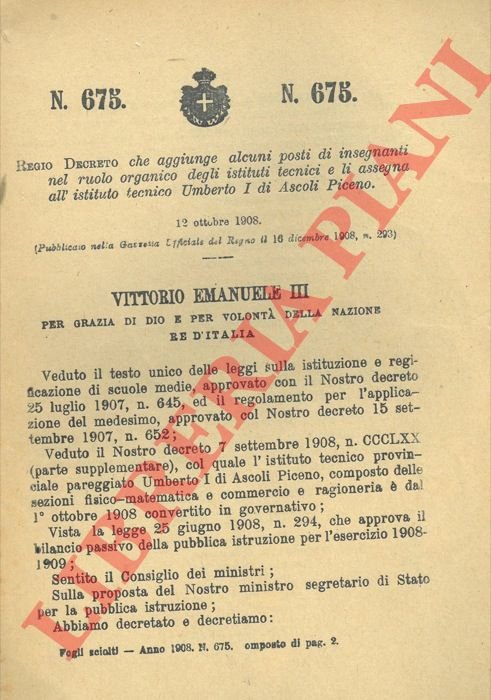 che aggiunge alcuni posti di insegnanti nel ruolo organico degli istituti tecnici e li assegna all'istituto tecnico Umberto I di Ascoli Piceno.