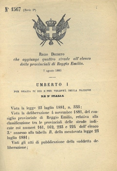 Monza, 1883, 7 agosto, firma Umberto I, Genala con stemma reale xil. pp. 4
