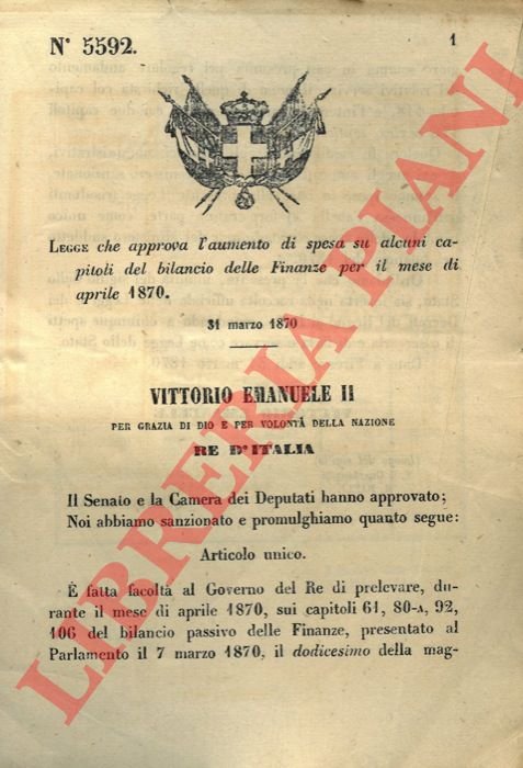 che approva l'aumento di spesa su alcuni capitoli del bilancio delle Finanze per il mese di aprile 1870.