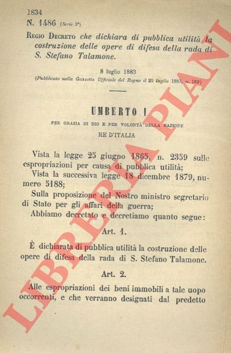 che dichiara di pubblica utilità la costruzione delle opere di difesa della rada di S. Stefano Talamone.