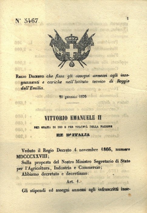 che fissa gli assegni annessi agli insegnanti e cariche nell'Istituto tecnico di Reggio dell'Emilia.