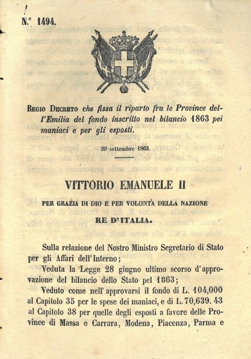 che fissa il riparto fra le provincie dell'Emilia del fondo inscritto nel bilancio 1863 pei maniaci e per gli esposti.