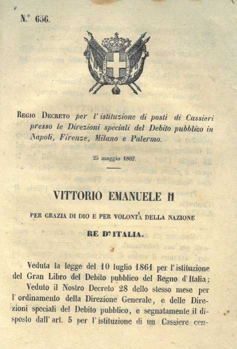 che istituisce dei posti di cassieri presso le Direzioni speciali del debito pubblico in Napoli, Firenze, Milano e Palermo.