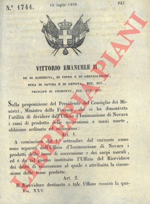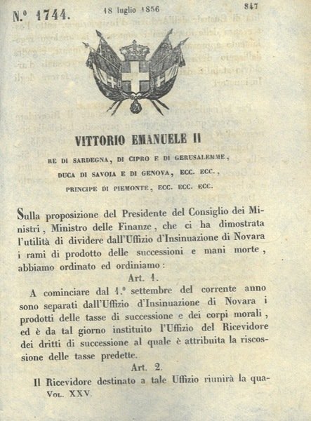che stabilisce che dal 1° settembre del corrente anno sono separati dall'Uffizio d'Insinuazione di Novara i prodotti delle tasse di successione e dei corpi morali, ed è da tal giorno instituito l'Uffizio del Ricevidore dei diritti di successione al