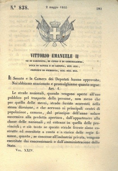 Torino, 1855, 2 Maggio, firma Vittorio Emanuele II, Paleocapa, stemma reale xil. pagg. 8