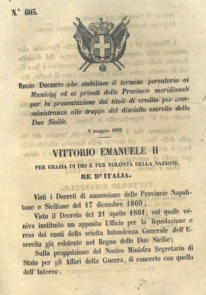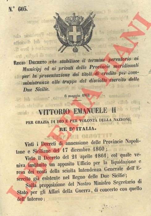 che stabilisce il termine per la presentazione dei titoli di credito per le truppe del disciolto Esercito delle Due Sicilie.