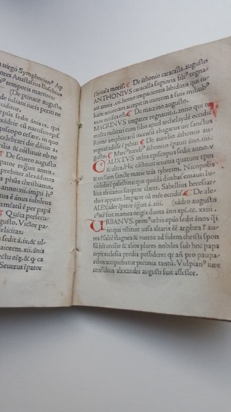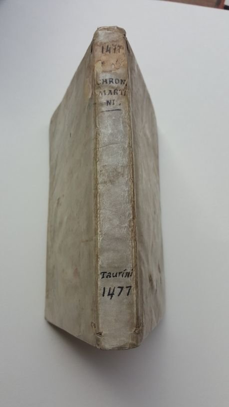 >in-4 (mm. 178x112), ff. 85 (su 90, mancando: f1, h1, h6, i5-6), legatura cinquecentesca in pergamena floscia, titolo e note tipografiche mss. al dorso. Car. tondo, lettere-guida per le iniziali, nella prima metà del volume le iniziali sono dipinte in rosso. E' Il quarto libro impresso a Torino, dai torchi del prototipografo Giovanni Fabri. Terza edizione dell'opera – che segue la prima del 1474 di Giovanni Filippo de Legnamine e quella romana di Giovanni Schurener del 1476 – ma con l'aggiunta dello stesso Fabri di notizie su Piemonte e Savoia. Le ultime 4 pagine danno notizie su Amedeo IX (secondo Duca di Savoia) prima a Vercelli "in sua dilecta & speciosa Vercellarum civitate" e poi a Torino "urbe primaria", nonché delle virtù che l'erede Filiberto, morto misteriosamente a 17 anni, avrebbe palesato "si deus optimum longiorem prestaverit vitam". L'aggiornamento parla in fine di Carlo il Temerario e della morte di Galeazzo Sforza. Il Fabri aveva stampato nel 1474 un "Breviarium Romanum" e nel 1476 la "Practica nova iudicialis". Dopo aver licenziato due edizioni a Caselle, ritornò a Torino nel 1477 con la celebre "Summa Lacticiniorum" di Pantaleone da Confienza e la presente "Chronica". L'arrivo in città sembrò segnare l'inizio di un nuovo periodo di vivace attività, perché entro pochi mesi apparvero anche i primi Statuti Sabaudi curati da Pietro Cara. Però dal maggio 1478 a fine marzo 1482, quando fu terminata di stampare l'Expositio Psalmorum del Torquemada, comparvero solo sei edizioni, "quantità assai modesta, che trova giustificazione nella povertà di mezzi e in parte forse anche nella scarsa propensione per la lettura e lo studio delle genti subalpine, alle quali sembra debbano esser riservati prevalentemente libri scolastici e volumetti di pietà e devozione" (Rinaldo Comba, Il basso Medioevo e la prima età moderna, 1975). Colophon al f. (90 r.): "Cronica Martini finit: Divo philiberto ac Sabaudorum sub duce magnanimo. Taurini; foris ac pressit: & aere: Iohannes Fabri: quem civem linoni alta tulit. Anno Mcccc.lxxvii. Die vero xxiii. Augusti". In buono stato di conservazione, malgrado le mancanze ed aloni d'umido agli ultimi 6 ff., strappo all'angolo inf. esterno dell'ultimo f., che riporta conti a penna al verso bianco; questo esemplare, con ex- libris ''Del Conte della Trinità'' (il balio Francesco Luigi Costa) eseguito all'acquaforte da Stagnon, e del Conte Andrea Bocca, fu venduto all'asta Bocca del 2.V.1932, poi dalla Libreria Hoepli e notificato nel 1960, venne poi de-notificato nel 1973. Rarissimo cimelio tipografico torinese, di cui sono noti una decina di esemplari, quasi tutti incompleti compreso quello del British M.; l'unico certamente completo e solo in USA è conservato all' Huntington Library. D.Rhodes, Giovanni Fabri tipografo del xv secolo in Torino ed in Caselle, 1975, pp. 101-110. Goff R189; HC 10859; Pell Ms 7721 (7626); IGI 8359; BMC VII 1053; GW M18341. Cosentini, Incun. Piemontesi n.19.