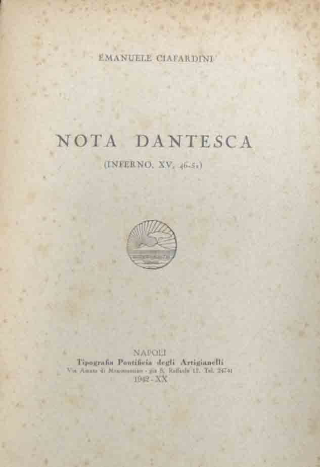 Emanuele Ciafardini, Nota dantesca (Inferno, XV, 46-51), Tipografia Pontificia degli Artigianelli, Napoli 1942, pp. 22, cm 25, opuscolo spillato. Estratto dal vol. XXII dei Rendiconti della R. Accademia di Archeologia, Lettere e Belle Arti della Società Reale di Napoli, 1942. Dedica manoscritta dell’autore alla prima pagina. Tracce d’uso, lievi fioriture e bruniture, per il resto ben conservato.