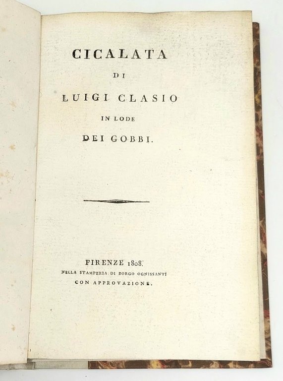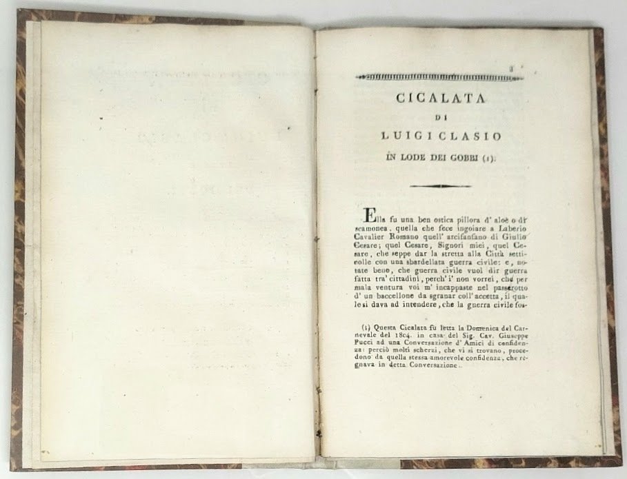 >in-8, pp. 31, (1), su ottima carta forte, carattere tondo. Legatura moderna in mezza pergamena, carta marmorizzata ai piatti. "Questa Cicalata fu letta la domenica del Carnevale del 1804 in casa del sig. Cav. Giuseppe Pucci ad una conversazione d'Amici di confidenza: perciò molti scherzi, che vi si trovano, procedono da quella stessa amorevole confidenza che regnava in detta Conversazione" (nota esplicativa a pag. 1). Prima edizione. Bell'esemplare. Gamba 2738.