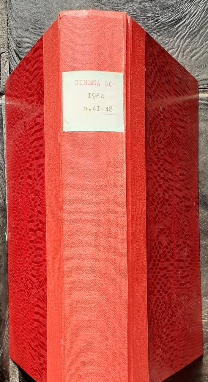 I ed., nn. 41-48 (7 fascicoli) - maggio-dicembre 1964 - anno V del mensile (Direzione-redazione-amm.ne: Via C. Battisti 133, Roma e, dal n. 47 del novembre 1964, Via Colonna Antonina 52 Roma) rilegati in unico volume in-8^ con copertina rifinita in carta rossa lavorata effetto serpente a i piatti e in carta rossa lavorata effetto tela al dorso. Titoli in nero e rosso in etichetta incollata al dorso. Nella rilegatura sono conservati i primi piatti delle copertine in cartoncino ruvido avorio con grafica in nero e colore in contrasto. Al fondo dei fascicoli pagine pubblicitarie. Stato buono (copertine e pagine brunite). Anno V, n. 41, maggio 1964, pp. 64: Il linguaggio della crisi e la crisi dei linguaggi - Anno V, nn. 42-43, giugno-luglio 1964, pp. 136: In questo numero doppio: Il libro "nero" del cinema italiano - Anno V, n. 44, agosto 1964, pp. 64: In questo numero, tra l'altro: La prima puntata di Questa è Hollywood! - Anno V, n. 45, settembre 1964, pp. 64: In questo numero, tra l'altro: La XXV Mostra di Venezia - Anno V, n. 46, ottobre 1964, pp. 64: In questo numero, tra l'altro: Lo spettatore Ivan Ivanovic - Anno V, n. 47, novembre 1964, pp. 72: In questo numero: Il bastione Ilic (la sceneggiatura integrale del film che non piacque a Krusciov) - Anno V, n. 48, dicembre 1964, pp. 64: In questo numero, tra l'altro: John Howard Lawson, La decadenbza di Hollywood.
