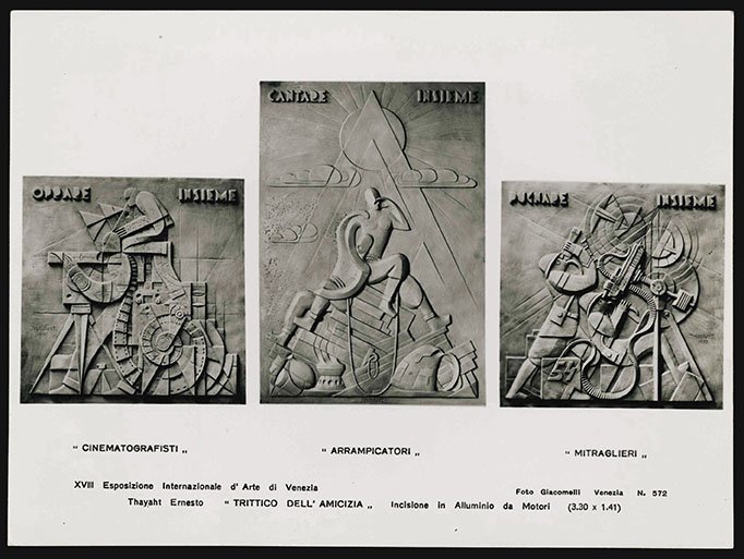 “Cinematografisti” - “Arrampicatori” - “Mitraglieri” - XVIII Esposizione Internazionale d’Arte di Venezia - Foto Giacomelli Venezia N. 572 - Thayaht Ernesto “TRITTICO DELL’AMICIZIA” - Incisione in Alluminio da Motori (3.30 x 1.41)