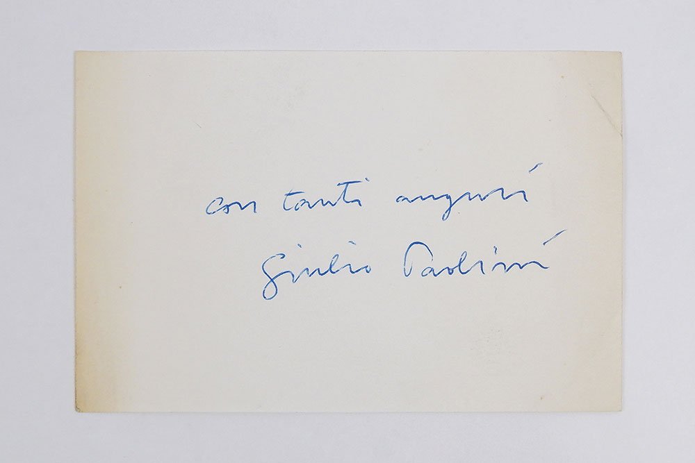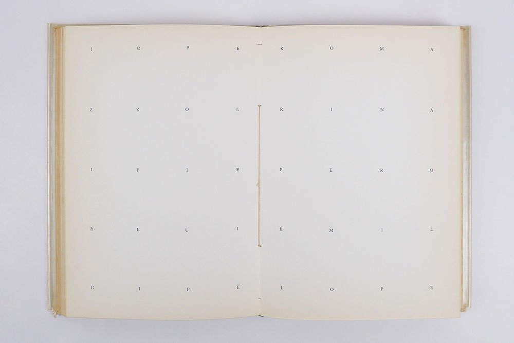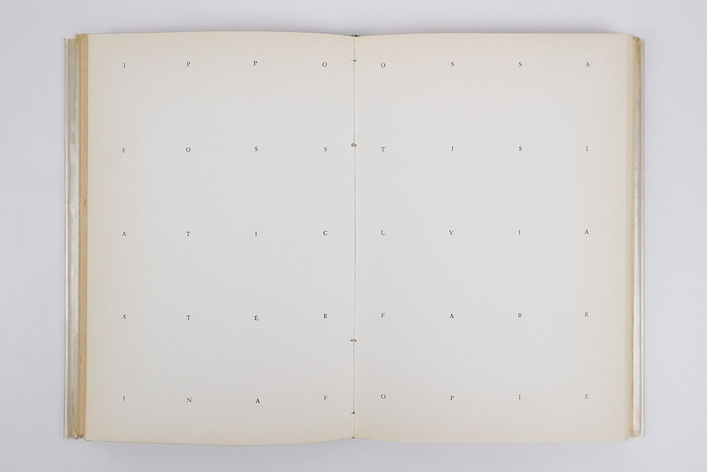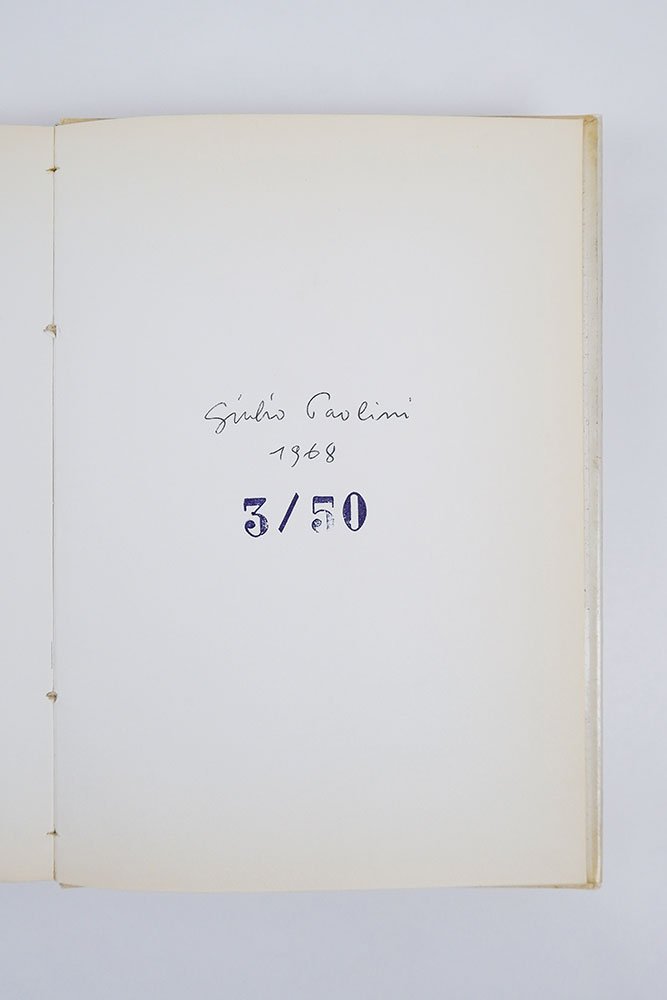 LIBROEdizione originale e unica.CON AUTOGRAFO.Copia numero 3 di 50 esemplari numerati e firmati, stampati in proprio dall’artista, in ottime condizioni. Normali segni del tempo alla sovracoperta e al cartonato; lieve e marginale fioritura alle prime e ultime carte, per il resto pagine interne pulite e tagli solo lievemente bruniti. Conserva biglietto autografo di Paolini: «Con tanti auguri Giulio Paolini».«Il pittore tende a ricondurre il molteplice all’uno (lo scritto, forse, il contrario). Uno degli emblemi che il pittore si è dato (ci sono momenti in cui si lascia visitare dal demone del simbolico) consiste in molti drappi di bandiere disparate, appesi a un’unica asta. L’ha intitolato col nome del filosofo che sostenne l’unicità dell’intelletto: Averroè. La mente del pittore si muove leggera nella nuda astrazione, ma se si dirige sulla pluralità delle cose corpose viene presa dalla vertigine della polverizzazione e dello sparpagliamento. In un libro stampato in 50 esemplari ha trascritto spaziate sul bianco della pagina, tutte le lettere dei nomi contenuti nel suo taccuino; è la sua immagine dell’infinito». Così Italo Calvino, nel suo prezioso saggio «La squadratura» posto in apertura a «Idem» (Einaudi, 1975), riassumeva la ricerca di Giulio Paolini e lo straordinario libro d’artista «Ciò che non ha limiti e che per sua stessa natura non ammette limitazioni di sorta» qui presentato. -- Stampato in proprio nel 1968 in soli 50 esemplari numerati e firmati (oltre a 6 prove d’artiste e 10 ad personam siglati con cifre romane), l’immagine dell’infinito richiamata dal grande scrittore ligure si dispiega qui lungo 174 pagine impresse con semplici lettere, ciascuna posta a intervalli regolari così da creare una composizione rigorosa e al tempo stesso labirintica per lo sguardo del lettore/fruitore. E sono sequenze alfabetiche apparentemente prive di senso quelle a cui Paolini dà vita in questo volume, solennemente protetto dalla copertina bianca con sovracoperta in acetato pesante su cui è serigrafato in calligrafia dell’autore il titolo (fatta eccezione per le prove d’artista in cui il titolo è scritto a mano sul piatto anteriore). “Apparentemente” prive di senso perché, in verità, quelle lettere rimandano ai nomi di persone presenti nell’agenda personale di Paolini nel momento della creazione, tanto da farsi traccia di presenze concrete e care e, al tempo stesso, simboli ormai astratti, slegati dal senso o alla ricerca di un senso altro. Come ha scritto il critico Germano Celant, questo libro d’artista — o, più propriamente, quest’opera d’arte — gioca con il nome proprio come segno insignificante, privo di valore universale poiché il valore compare solo quando il nome si incarna in un soggetto personale a cui si è, altrettanto personalmente, legati, riprendendo un motivo già sviluppato da Paolini nella coeva «Titolo, 1967-68». Ma oltre un tale viaggio dentro la vuota astrattezza dei nomi quando essi perdono un sicuro rimando alle persone e alle cose, «Ciò che non ha limiti e che per sua stessa natura non ammette limitazioni di sorta» si offre come simbolo delle nuove identità che si possono generare quando, disgregando la forma iniziale, si dà inizio a inattese relazioni e riformulazioni.Maffei, Arte Povera, pp. 122-123