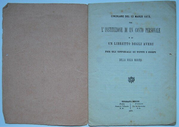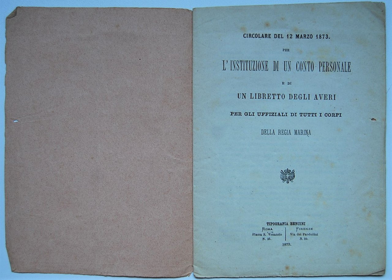 CIRCOLARE DEL 12 MARZO 1873 PER L'ISTITUZIONE DI UN CONTO PERSONALE E DI UN LIBRETTO DEGLI AVERI PER GLI UFFICIALI DI TUTTI I CORPI DELLA REGIA MARINA.