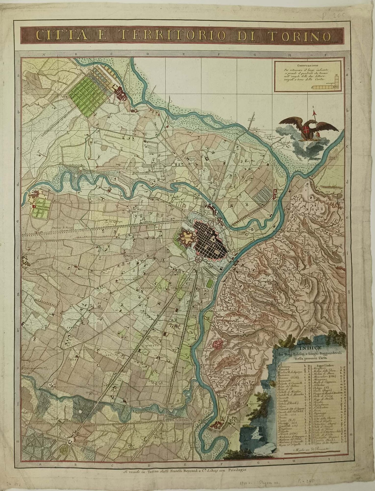>Incisione in rame (mm 625 x 488), non firmata, di Antonio Maria Stagnon su disegno di Carlo Randoni, con coloritura posteriore. In alto, il titolo "Città e territorio di Torino"; subito sotto, riquadro con "Osservazione" ed aquila napoleonica. In basso indicazioni tipografiche "Si vende in Torino dalli Fratelli Reycend e C.a Libraj con Privilegio". In basso a destra, indice con 57 richiami. Carta topografica del territorio di Torino. L'incisione riprende il rame di qualche anno prima, firmata da A. M. Stagnon, con la soscrizione al posto dell'indice. Esemplare ben conservato. Peyrot, I, 265