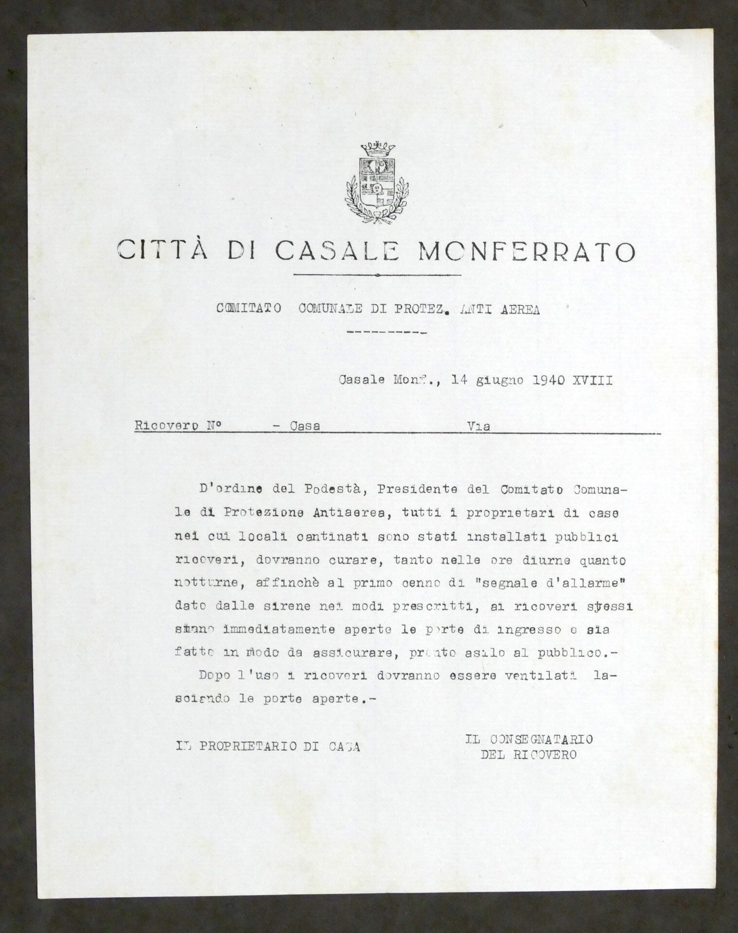 Città di Casale Monferrato - Comitato Comunale di Protezione Antiaerea - Informazioni ad uso dei proprietari dei ricoveri - 14 giugno 1940 Un foglio, dimensioni: 22 x 28 cm ca. Lingua italiana. Condizioni molto buone.