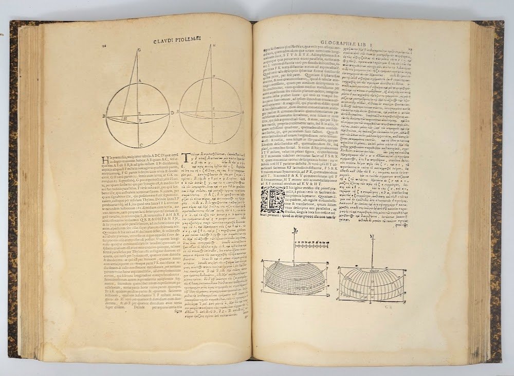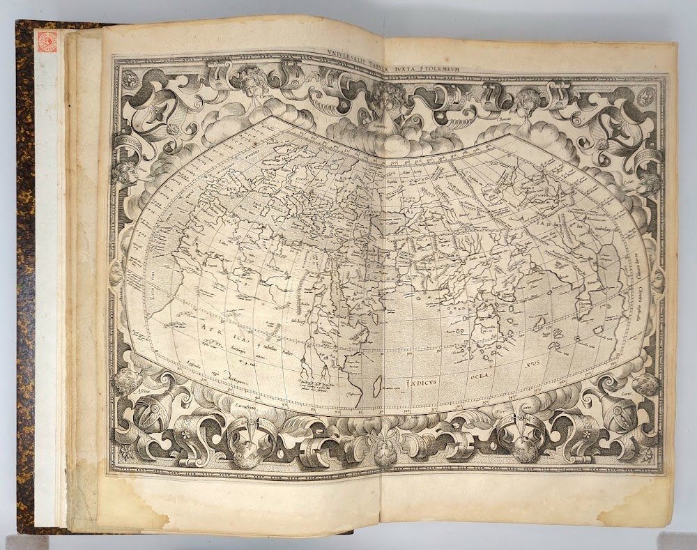 >in-folio, (409x207 mm), ff. (6, compresi titolo e ritratto), 27 carte su doppio foglio ed una su f. singolo, ff. (116, l'ultimo bianco), pp. 215, ff. (32), legatura 800esca m.pelle, titolo e fregi in oro al dorso. Frontesp. inciso, ritratto di Mercatore inciso al verso dell'ultimo f. preliminare, un planisfero contornato da ricca bordura con allegorie dei venti, 10 carte dell'Europa, 5 dell'Africa e 12 dell'Asia, decorate da ricchi cartigli; diagrammi e fregi nel testo. Prima edizione con testo greco e latino della Geographia di Tolomeo, e primo libro in greco impresso ad Amsterdam. Fu curata da Petrus Montanus (1572-1632), mentre il tipografo pare essere Jan Theusniz, che si trasferì da Leyda nel 1604. Le 28 decorative carte geografiche si debbono a Gerardo Mercatore (1512-1594) che le aveva pubblicate con il solo testo latino nel 1578 e nel 1584. Egli non si limitò a copiare e rielaborare le carte degli atlanti precedenti: la sua grandezza sta nell'aver creato delle carte originali, in base alle nuove proiezioni che portano ancora oggi il suo nome. Frontespizio con aloni di polvere e porzione di margine restaurato, lieve uniforme ingiallitura, e qualche alone marginale. Koeman Me3: ''This is the first edition with the Greek text next the Latin text... The Ptolemy edition of 1605 is the first work printed in Greek at Amsterdam and a typographic masterpiece''. Phillips 421 (nota).
