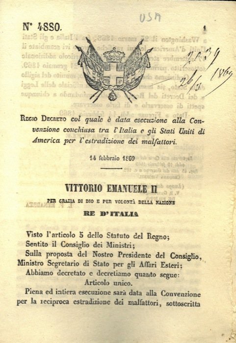 col quale è data esecuzione alla convenzione conchiusa fra l'Italia e lgli Stati Uniti di America per l'estradizione dei malfattori.