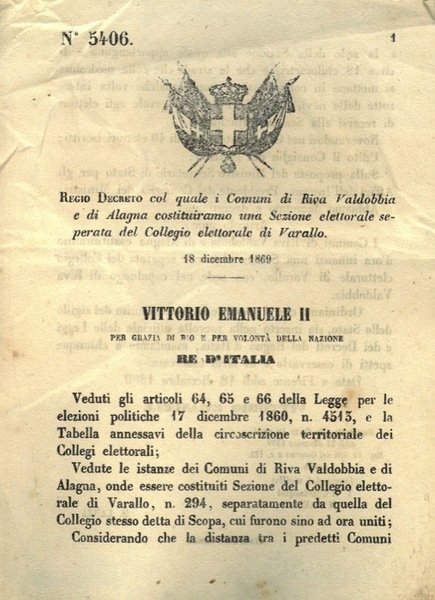 col quale i Comuni di Riva Valdobbia e di Alagna costituiranno una Sezione elettorale separata del Collegio elettorale di Varallo.