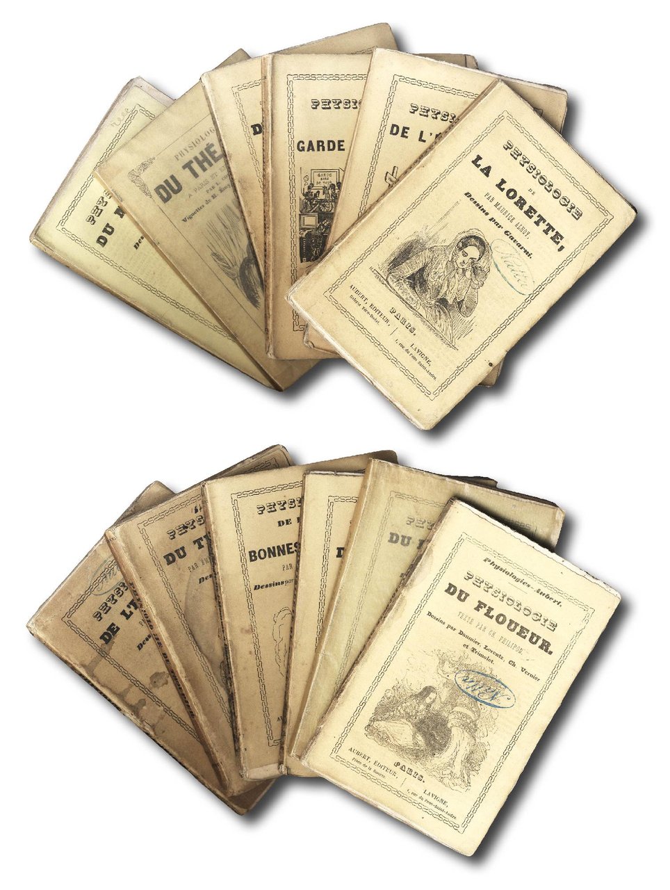 >12 volumi in-12 (mm 137x89), ciascuno di 120 pp., brossure originali figurate, conservato in due custodie moderne in mezzo marocchino. Edizioni originali riccamente illustrate: Phys. del Dipendente, di Balzac. - Fis. del Flâneur, di Huart. - Fis. di Blurter, di Philipon. - Fis. della Guardia Nazionale, di Huart. - Fis. dell'Uomo con buona fortuna, di Lemoine. - Fis. de la Lorette, di Alhoy: - Phys. del Dottore, di Huart. - Fis. del teatro, di Couailhac. - Fis. del Trooper, di St. Hilaire. - Fis. dalla portinaia, di J. Rousseau. - Fis. dello studente, di Huart. Opere in gran voga a metà del XIX secolo; in buono stato di conservazione.
