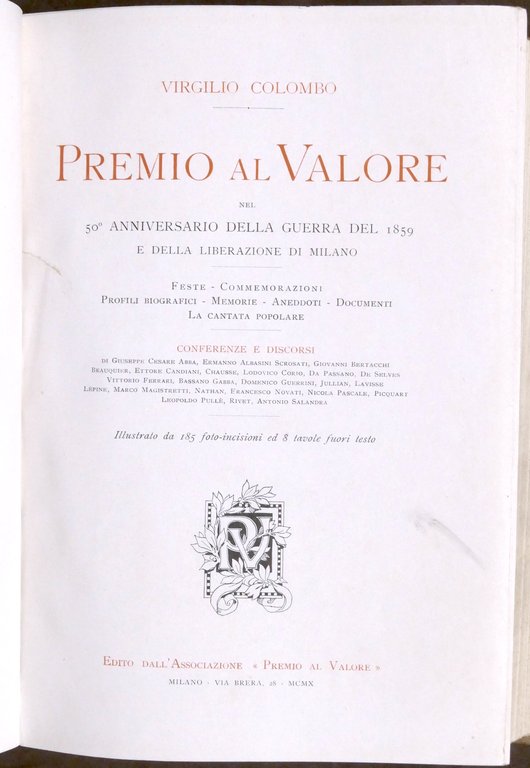 Virgilio Colombo - Premio al valore nel 50° anniversario della guerra del 1859 e della liberazione di Milano - Feste, commemorazioni, profili biografici, memorie, aneddoti, documenti, la cantata popolare - 1^ ed. 1910 Pag. XIX, 830 con illustrazioni. Copertina rigida - Testo in italiano. Condizioni generali molto buone. Frontespizio e dorso come da foto.