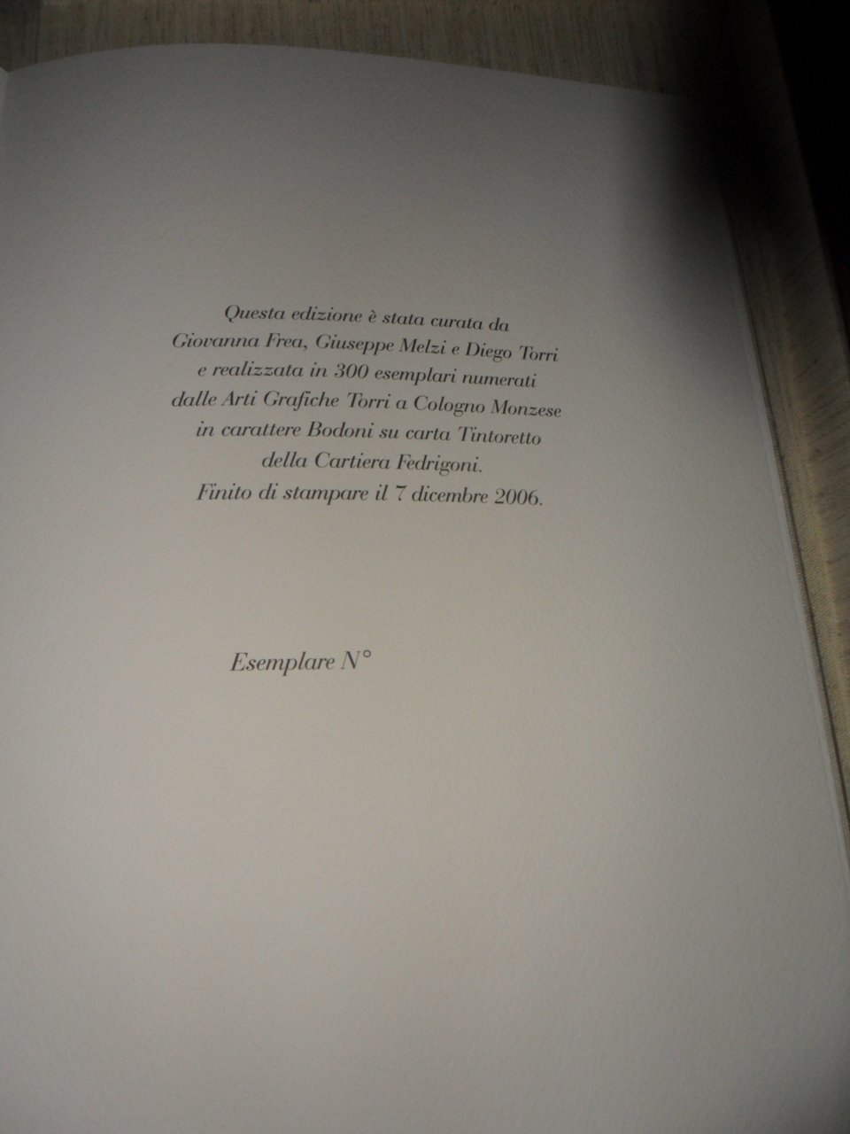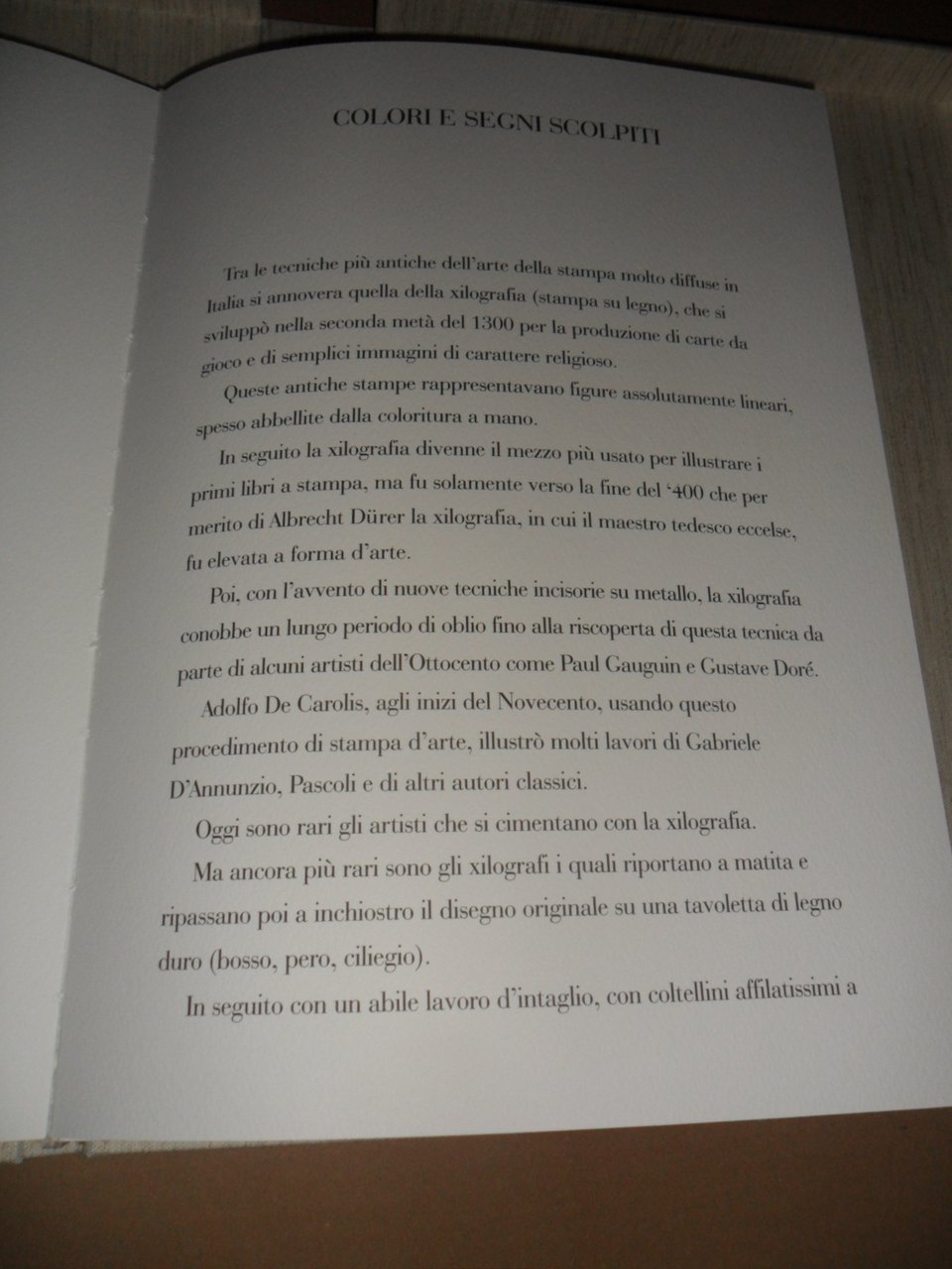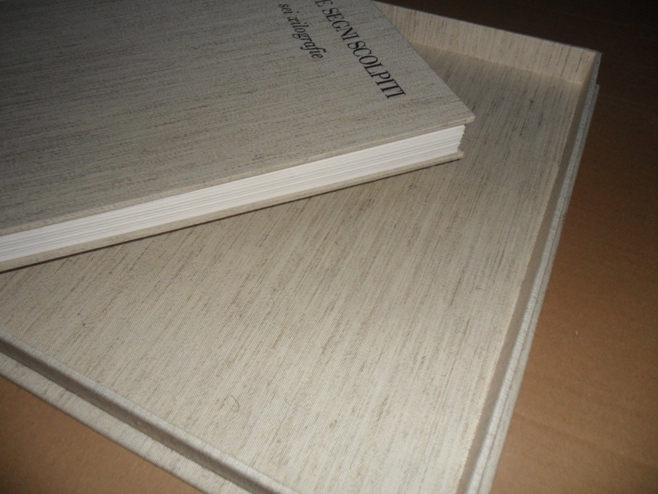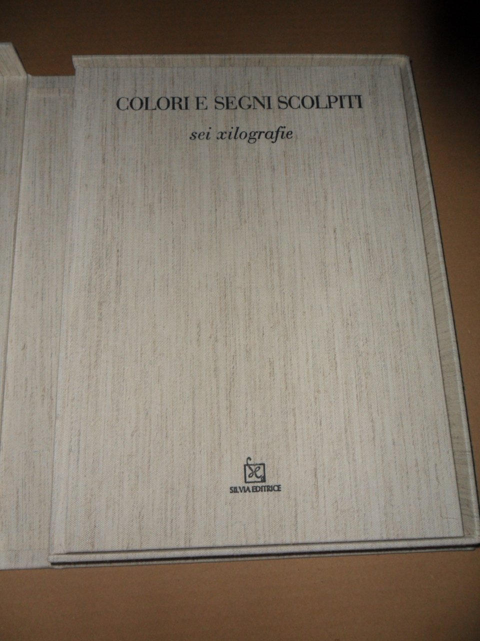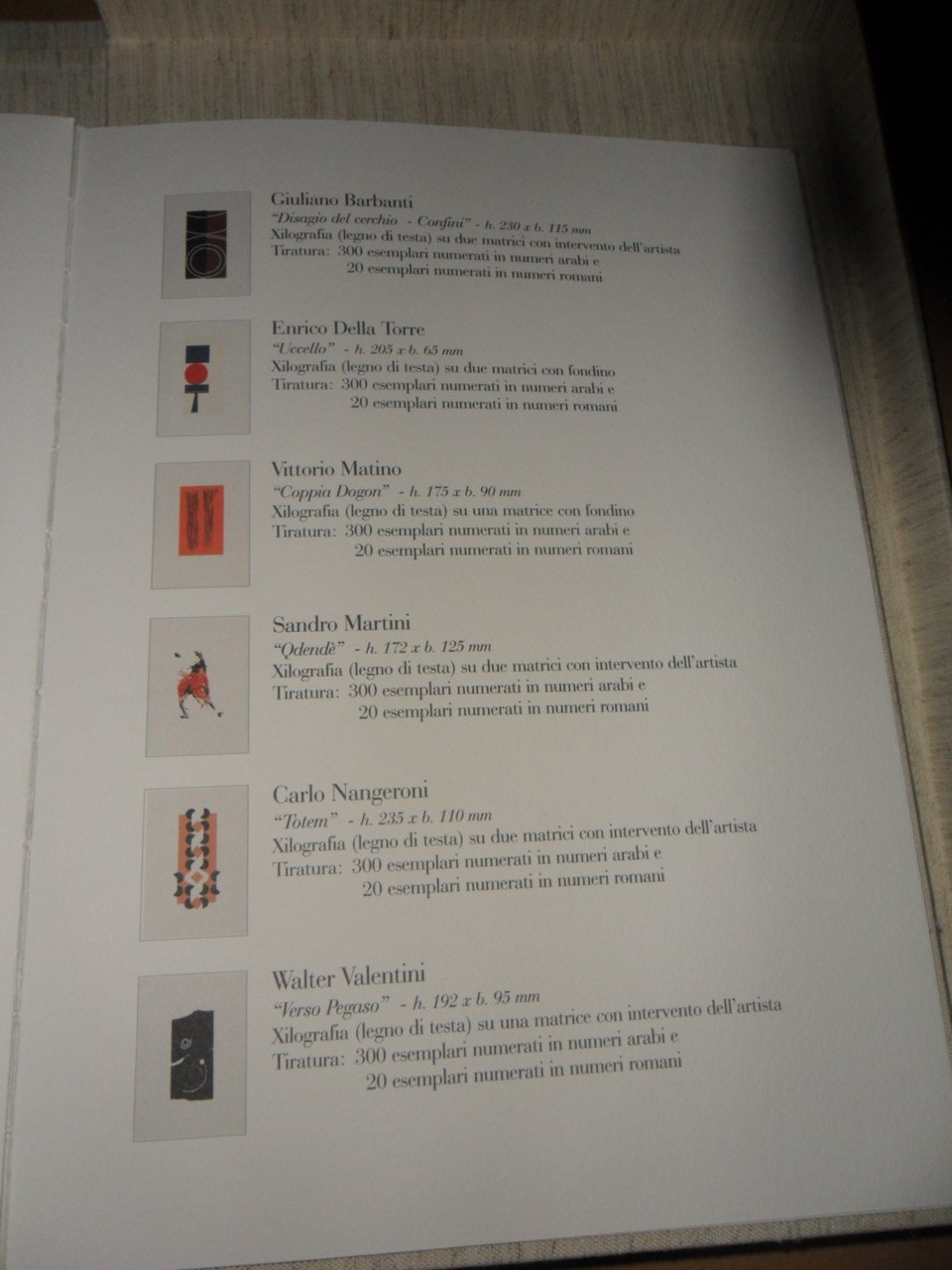 Cofanetto in cartone tutto lino formato cm 38,5X28,5 contenente un volume stesso formato tutto lino. 8 pagine in carta forte + 6 con patelle e contenenti ognuna una Xilografia originale a colori. Testo di Luigi Sansone. Tiratura in 300 copie