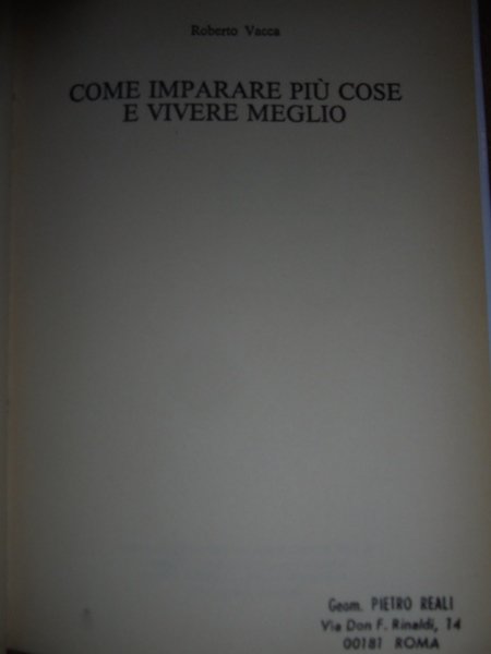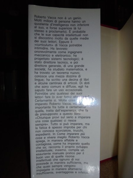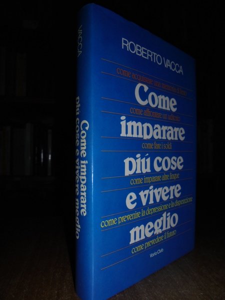 Roberto, Vacca. Bergamo, Varia Club, 1982. Come imparare più cose e vivere meglio. In-16° grande, similtela rossa con sovracopertina. 233, (1) pp. Carta con naturale lieve ingiallimento e con timbro di ex proprietà nel margine del front. ma ben conservato. Neg. lett. mod. mob. C.