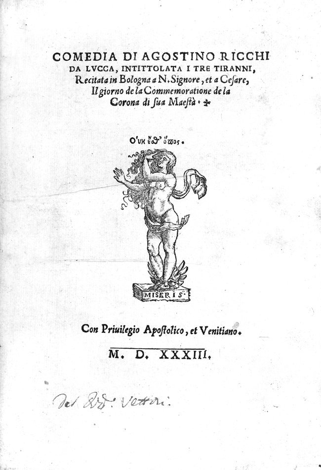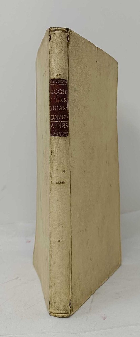 >in-4 (191 x 135 mm.), ff. (72), caratt. corsivo; leg. antica p. perg. rigida, tit. su tassello al dorso. Figura simbolica sul titolo. Precedono il testo la dedica dell'A. al Card. Ippolito de Medici, datata 25 lug. 1533, e un avviso ai lettori di A. Vellutello in cui si "svela l'allegoria della Favola". Prima edizione, rarissima, di questa commedia, in 5 atti in endecasillabi sciolti, che è l'unico testo teatrale del lucchese A. Ricchi, composto all'età di appena diciott'anni. Venne rappresentata a Bologna per le feste dell'incoronazione di Carlo V, alla presenza del Papa Clemente VII e del Duca di Firenze, «che potevano apparire, per una singolare allusione, i protagonisti della commedia. Il titolo è però ispirato al fatto che tre uomini, un vecchio, un giovane e un ricco, nutrono violenta passione per una fanciulla; ma in realtà il vero tiranno di tutta la vicenda è l'amore, che obbligas alla fine i tre personaggi a sottostare a un destino quale essi non si ripromettevano...La commedia, originale, bizzarra, e ricca di ''spirito'' è equilibrata con sapiente decoro e con dosato allegorismo» (Chiesa, Teatro ital. del Cinquecento, n. 198). Vivacemente disegnata risulta la figura del parassita Pilastrino, ''ghiottone e cinico'', avvicinabile, secondo Sanesi (I, p. 271) al Margutte del Pulci. Esemplare fresco e marginoso (lieve restauro all'angolo super. bianco degli ultimi 27 fogli). Allacci p.782. Mango 34. BMC 554. Adams R-484. Clubb 726. Regestein 515. Soleinne IV, 4126.