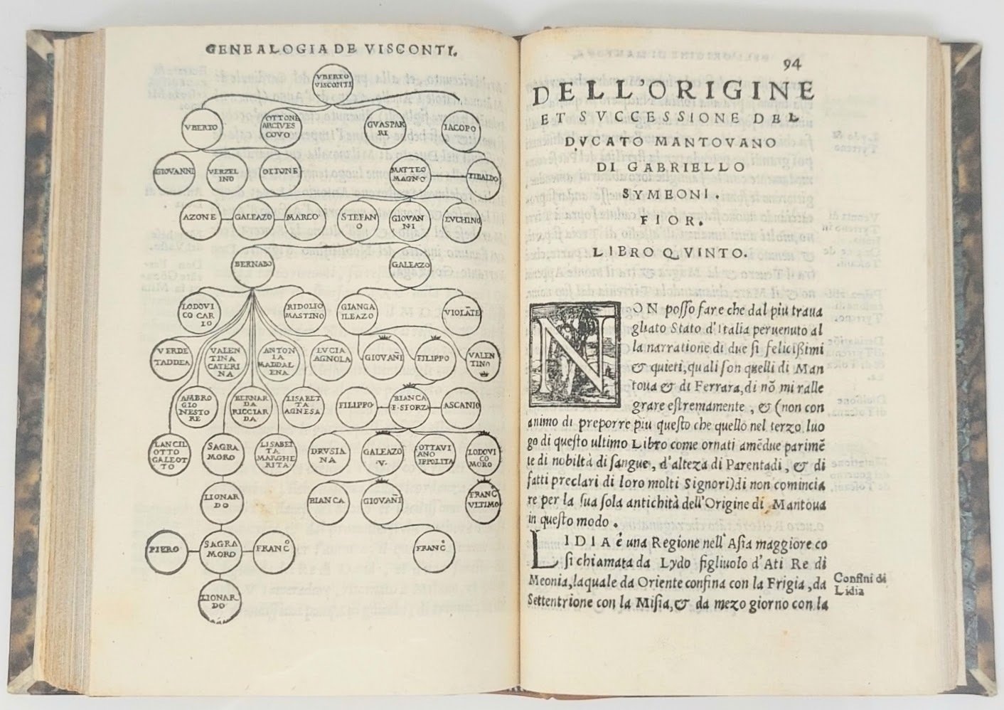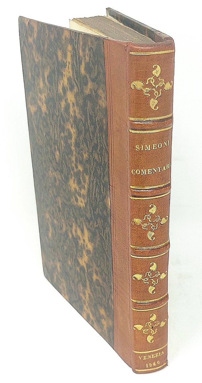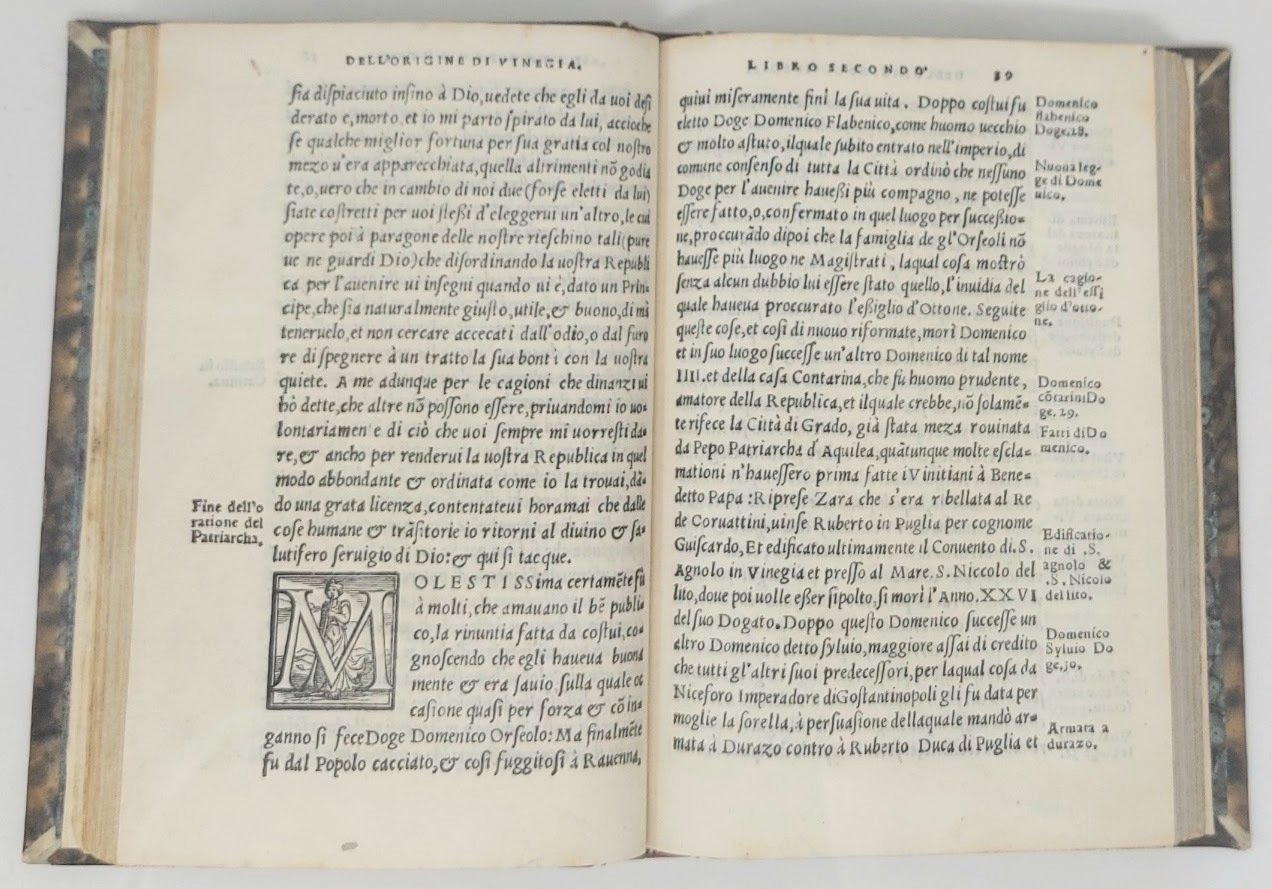 >in-8 (144x95 mm), ff. (4), 110, (18 di indici), bella legatura ottocentesca in m. vitellino, titolo, filetti e fregi in oro su dorso a nervi (piccola mancanza alla cerniera anteriore). Ritratto ovale dell'autore al frontespizio, numerose iniziali ornate e 3 tavole di alberi genealogici dei Visconti, dei Gonzaga e degli Estensi, il tutto in xilografia. Testo in nitido car. corsivo, note in car. tondo nei margini. Dedica al nobile veneziano Francesco Donato. Prima edizione di quest'opera di storia municipale divisa in cinque libri, di cui i primi tre trattano dell'origine di Venezia fino al 1545, il quarto di Milano ed il quinto di Mantova e Ferrara sempre fino al 1545. Buon esemplare, lievi bruniture a margini di alcuni fogli, al frontespizio traccia di timbro e forellino al margine inferiore. STC 629. Adams S-1158. Predari 192. Cat. Hoepli 944 (ed. post.). Manca a Lozzi e Platner.