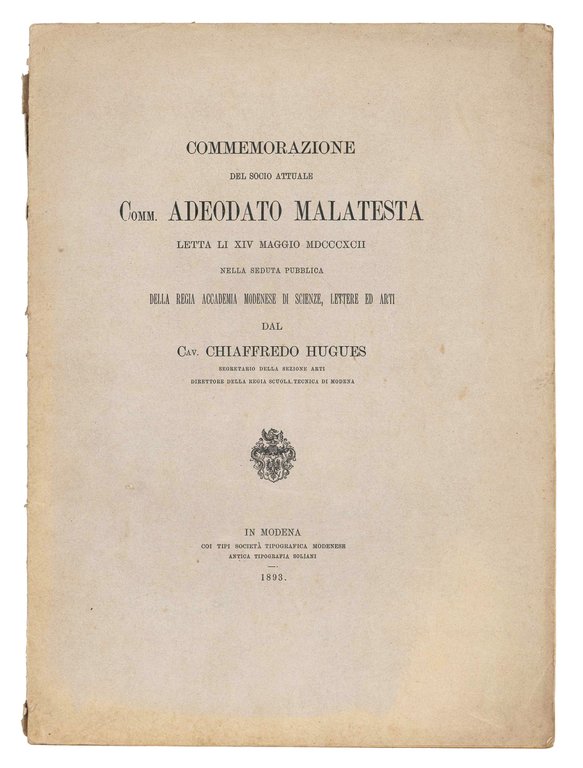Mm. 324x235; pp. 66, (2). Carta leggermente ed uniformemente brunita. Brossura editoriale con titolo alla copertina anteriore. Primi fascicoli un po' sciolti, piccole mancanze al dorso e lievi aloni alle copertine, ma nel complesso ottimo esemplare. Estratto editoriale delle Memorie della R. Accademia di Scienze, Lettere e Arti d Modenea Vol. IX, Serie II. Commemorazione di Adeodato Malatesta (1806-1891) tenutasi nell'anniversario della nascita, contenente la descrizione di alcune sue opere e l'elenco dei quadri presentati all'Esposizione malatestiana dell'aprile del 1886.