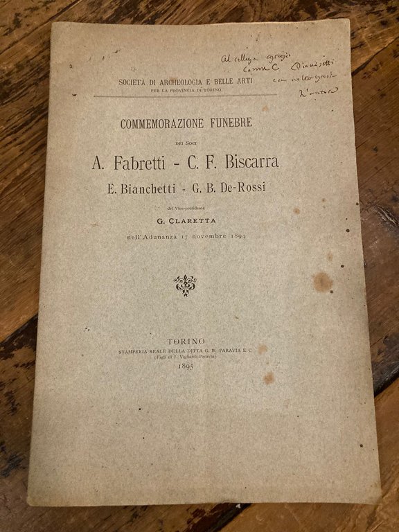 Commemorazione funebre dei Soci A. Fabretti - C. F. Biscarra - E. Bianchetti - G. B. De Rossi del Vicepresidente G. Claretta nell' Adunanza 17 novembre 1894 - Società d' archeologia e belle arti per la provincia di Torino