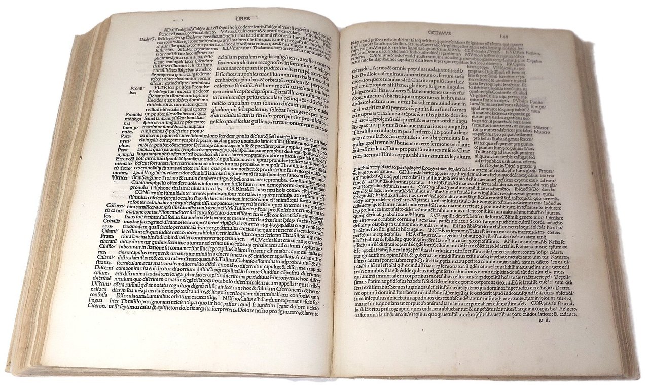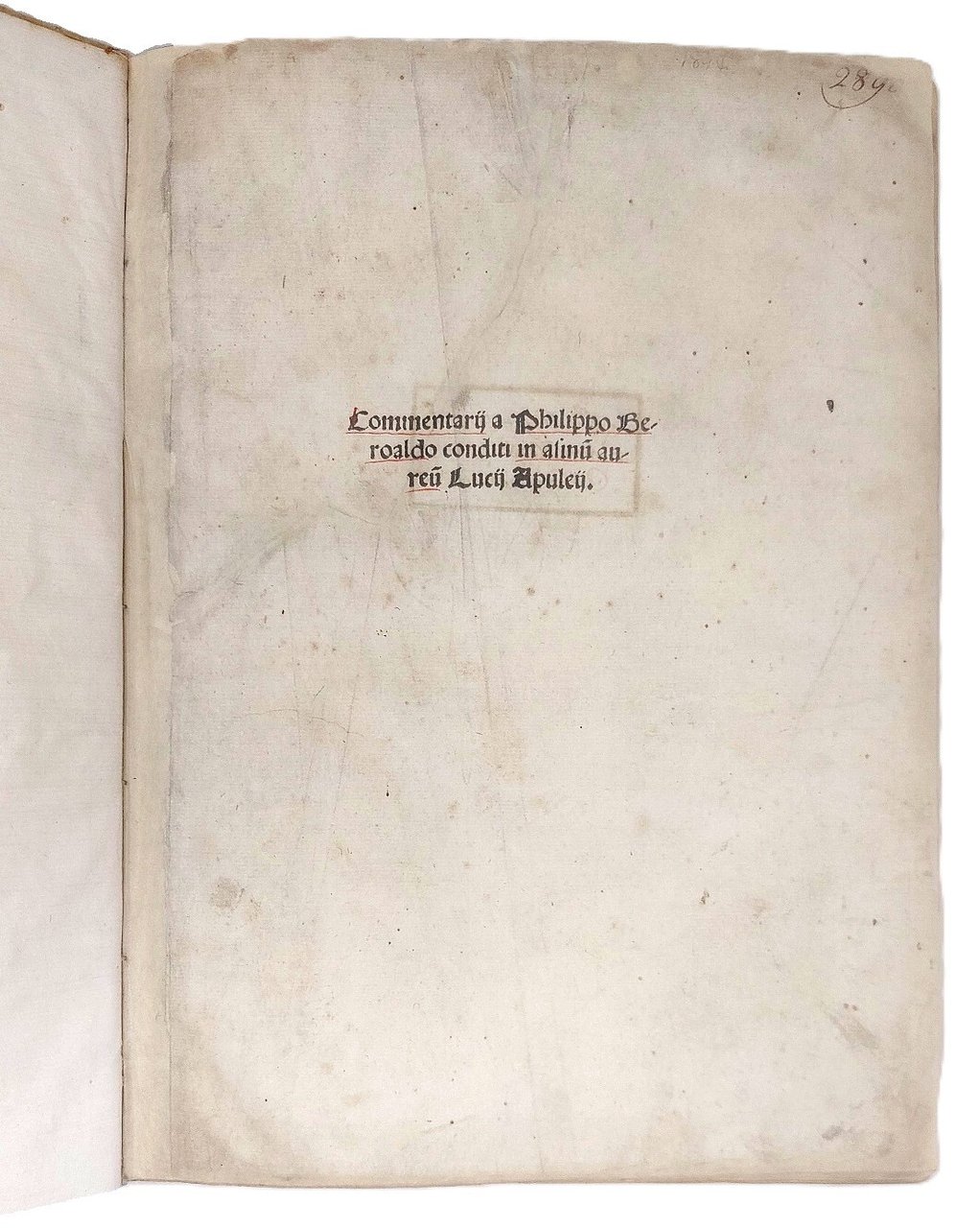 >in-folio (290x210 mm), ff. 242 numerati per errore 237, legatura coeva in pergamena. Al f.1recto titolo in carattere gotico, verso bianco, al f. 2recto "Registro" e al verso splendida bordura xilografica con colonne, personaggi e leoni, in basso due putti alati reggono uno scudo (già utilizzata per il celebre Dante di Benali Capcasa del 1491). Gran numero di iniziali ornate su fondo nero, car. tondo, testo incorniciato dal commento. Terza edizione dello stimato commento beroaldiano all'Asino d'oro: apparso per la prima volta a Bologna nel 1500, costituì l'inizio della fortuna letteraria del romanzo nel Cinquecento. Filippo Beroaldo il Vecchio (1453-1505) fu eruditissimo umanista, commentò, con frequenti digressioni, molti autori latini e di altri curò l'edizione; fu autore inoltre di alcune orazioni. Buon esemplare, primi 4 ff. rimarginati all'interno, alcune tracce di polvere; antichi timbri di possesso al verso del primo f. ed in fine. Adams A-1372; Essling 1322; Sander 484. Choix 4031.