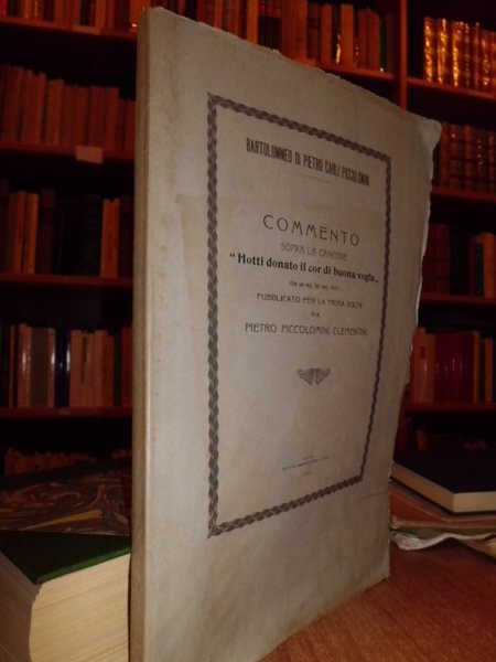Bartolomeo Carli, Piccolomini. Siena, tip. e lit. Sordomuti ditta L. Lazzeri, 1909. Commento sopra la canzone << Hotti donato il cor di buona vogla >> (da un ms. del sec. XVI) pubblicato per la prima volta. In - 4°, br., cop. orig. (4), 121, (3) pp. Con 2 ritratti dell' autore e 2 facsimili di autografi ripiegati f.t. Edizione a tiratura limitata in carta a mano. Esemplare intonso a fogli chiusi. Neg. Mob. 8