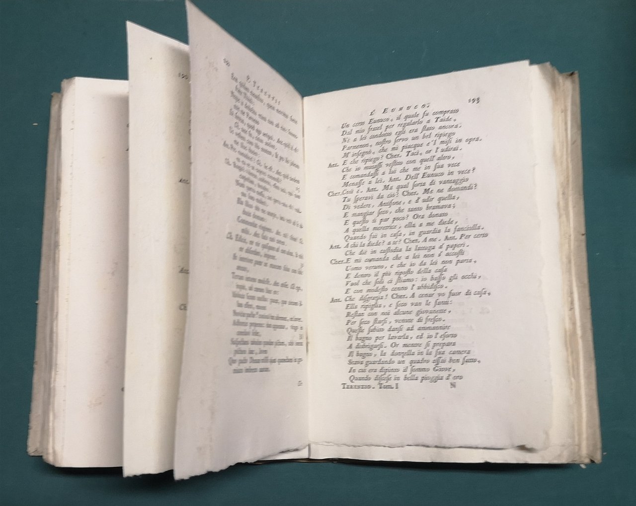 >2 vol., in-8, leg. cartoncino rustico, tassello con tit. manoscritto ai dorsi. Sul front. del primo volume ritratto inciso in rame dell'autore in medaglione. Testo latino e traduzione italiana a fronte di ignoto autore; comprende, ciascuna con proprio occhietto: - vol. I: Vita di Terenzio, L'Andria, L'Eunuco, Heautontimorumenos, ovvero il punitore di se stesso, pp. VIII, 402. - vol. II: Gli Adelfi ossia i due fratelli, Il Formione; L'Ecira; pp. (2), 381, (1). Bell'esempl. a pieni margini con barbe. Graesse, VII, 61.