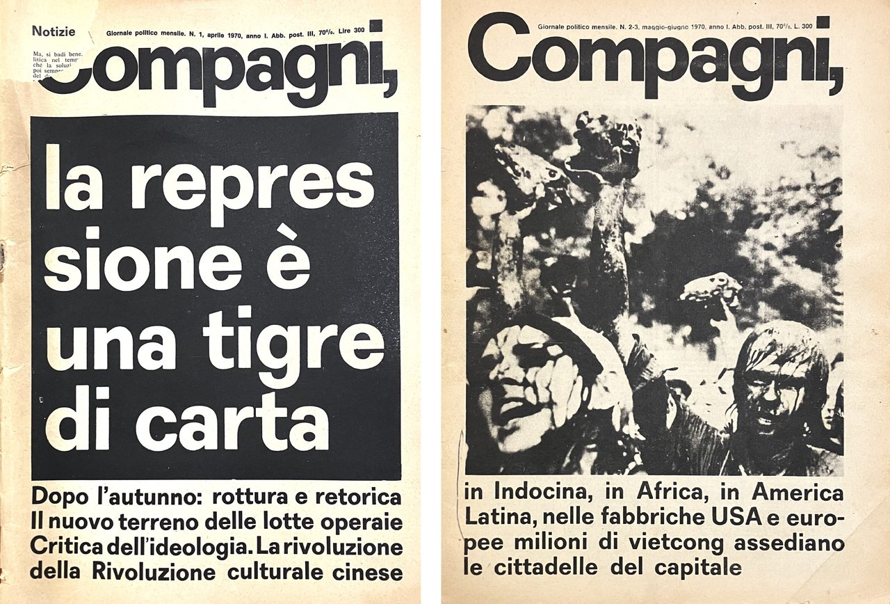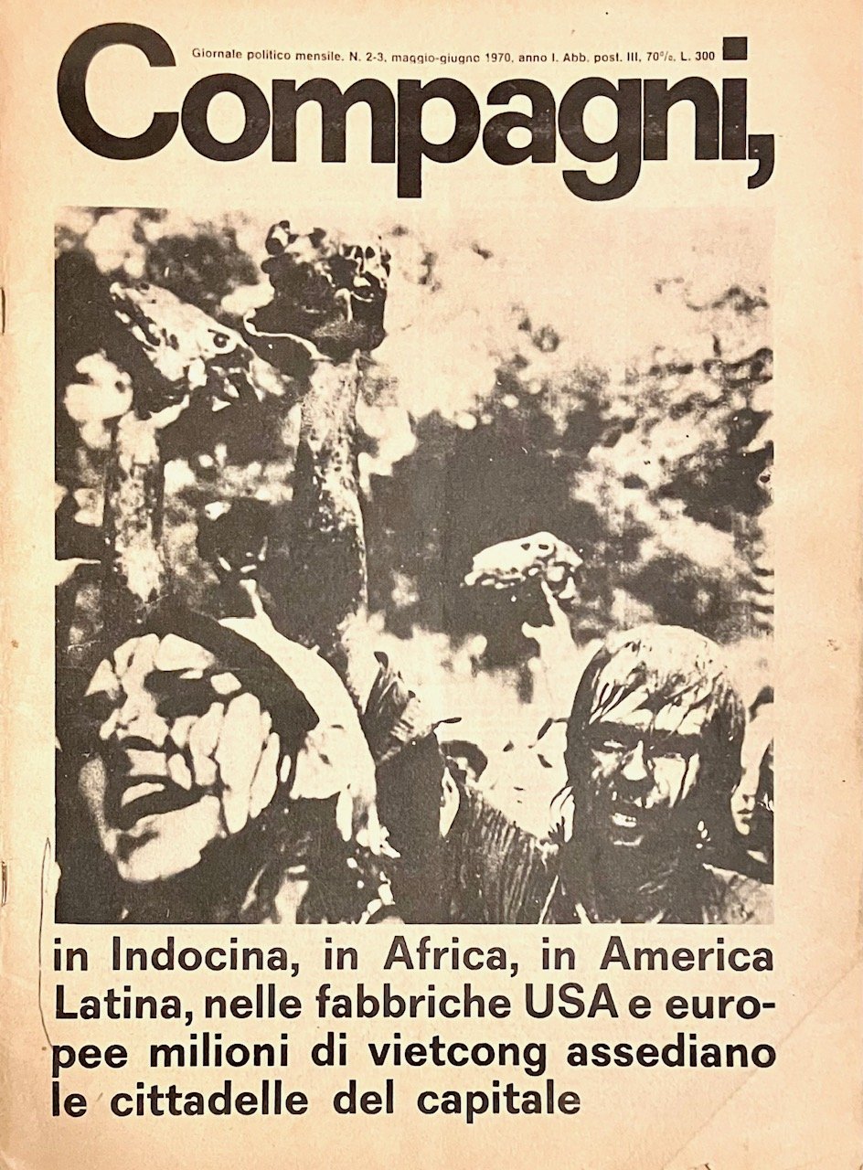 Nata principalmente dall'area di Potere Operaio, la rivista fu ideata da Balestrini poco dopo la chiusura di "Quindici", da cui ereditò l'autore del progetto grafico Giuseppe Trevisani (testo su più colonne senza interruzioni). Legatura con punti metallici, tre numeri in due fascicoli, redattore Bruno Crimi, responsabile Letizia Paolozzi. Comprende una cospicua rassegna sui movimenti internazionali, con contributi di Oreste Scalzone, Sergio Bologna, Guido Neri, Paolo Gambazzi, Giorgetta Moech, Bruno Bezza, Toni Negri, Lapo Berti, oltre che un'intervisa a Gian Giacomo Feltrinelli, allora latitante, sulla strategia della tensione, l'articolo "Il potere musicale" del compositore Luigi Nono. Due storie a fumetti di Alfredo Chiappori (Up il sovversivo), una vignetta di BUS e un disegno a piena pagina di Corrado Costa sulla visita di Paolo VI in Sardegna. Copertina del N. 1 staccata con mancanza marginale di 5 cm alla prima pagina (interessa in minima parte il testo), segno a penna alla prima pagina del N. 2/3, all'interno in ottimo stato.