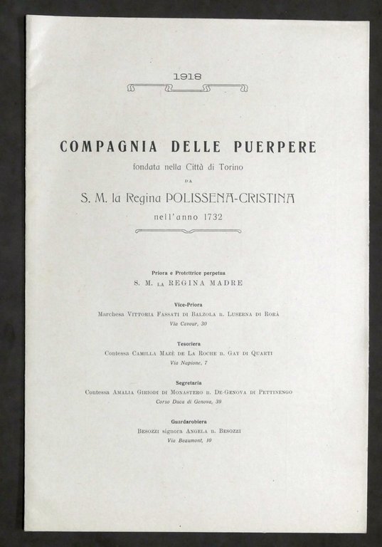 Compagnia delle Puerpere fondata nella Città di Torino - Elenco delle Consorelle - 1918 Pag. 16 Copertina morbida - Testo in italiano. Condizioni molto buone.