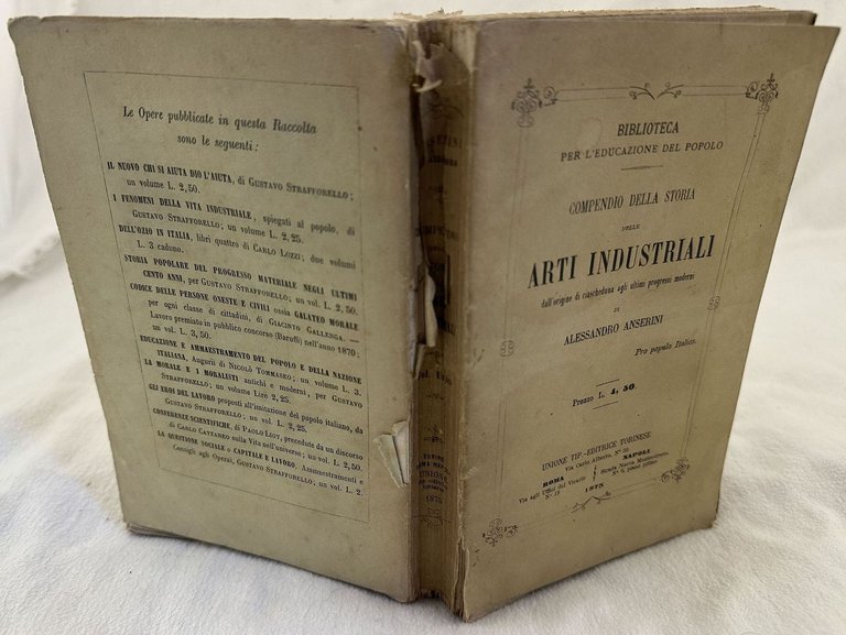 Edizione del 1887 di questa monografia di storia industriale scritta da Alessandro Anserini. All'interno: arti note ai tempi preistorici; Arti note ai popoli più antichi (Babilonii ed Assirii, Egiziani, fenici, indiani e cinesi), Civiltà greca, Civiltà romana; Arti note al medio evo (tra cui alimenti, molini, bevande artificiali, vetri, distillazione, cuoio e pelliccerie, armi, orologeria, carta, stampa, carte da giuoco, carte geografiche, mosaici ecc.); Influenza delle scoperte geografiche e delle macchine (olio paste sale vini, acquavite e liquori, birra; strade e ferrovie, materiale delle ferrovie, Locomotive stradali; Galleria del Moncenisio; Strada ferrata dal Pacifico all'Atlantico; Strada ferrata del Perù, Navigazione (navi, marina mercantile, pesca), Arti relative alla casa (camini, bagni, mobilio, locande, maioliche e porcellana, perle artificiali, lumi artificiali, sapone, cordaggi, carta), Tessuti e macchine relative, Arti minerarie, Macchine, ausiliarii delle scienze (telescopio, microscopio, barometro, incisione, litografia, tipografia, fotografia, elettricita, brevetti di invenzione ecc.). In buone condizioni generali. Copertina editoriale in discrete condizioni generali con usure ai margini e dorso. Legatura in buone condizioni. All'interno le pagine si presentano in buone condizioni con fioriture. In 8. Dim. 19x12,5 cm. Pp. 550.Edition of 1887 of this monography of industrial history written by Alessandro Anserini. Inside: arti note ai tempi preistorici; Arti note ai popoli più antichi (Babilonii ed Assirii, Egiziani, fenici, indiani e cinesi), Civiltà greca, Civiltà romana; Arti note al medio evo (tra cui alimenti, molini, bevande artificiali, vetri, distillazione, cuoio e pelliccerie, armi, orologeria, carta, stampa, carte da giuoco, carte geografiche, mosaici ecc.); Influenza delle scoperte geografiche e delle macchine (olio paste sale vini, acquavite e liquori, birra; strade e ferrovie, materiale delle ferrovie, Locomotive stradali; Galleria del Moncenisio; Strada ferrata dal Pacifico all'Atlantico; Strada ferrata del Perù, Navigazione (navi, marina mercantile, pesca), Arti relative alla casa (camini, bagni, mobilio, locande, maioliche e porcellana, perle artificiali, lumi artificiali, sapone, cordaggi, carta), Tessuti e macchine relative, Arti minerarie, Macchine, ausiliarii delle scienze (telescopio, microscopio, barometro, incisione, litografia, tipografia, fotografia, elettricita, brevetti di invenzione ecc.). In good general conditions. Editorial cover in fair general conditions with wearings and tears in the extremities. Binding in good conditions. Inside pages are in good conditions with foxings. In 8. Dim. 19x12,5 cm. Pp. 550.