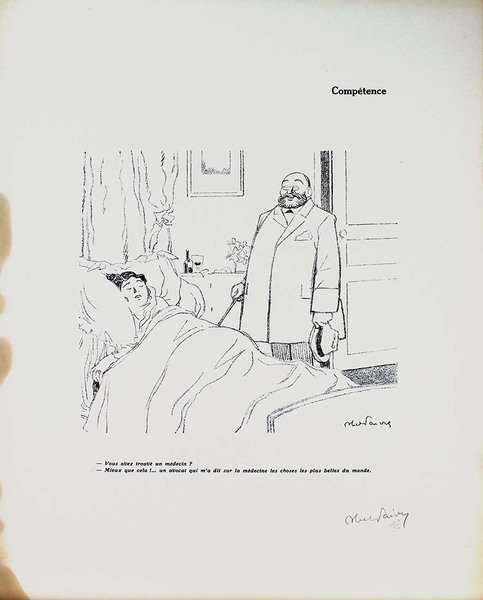 Abel Jules Faivre (Lione 1867 - Nizza 1945) Litografia originale firmata a mano dall'artista.Dimensioni: 56 x 38,5 cmCon certificato di autenticità C.O.A.Ingiallimento laterale come da foto.Esemplare numero 62/250 La raccolta di litografie umoristiche del caricaturista francese Abel Faivre (Lione 1867-Nizza 1945), andata a confluire nel volume Jours de guerre,fu pubblicata in due tomi tra il 1915 e il 1919. Con il procedere del conflitto, l'opinione pubblica di tutti i paesi coinvolti,che aveva dapprima affrontato tale evento con ottimismo, mutò rapidamente opinione sino a considerare la guerra, senza mezzi termini,come un avvenimento rovinoso. In tale contesto, le vignette satiriche di guerra possedevano un potente effetto catartico,adempivano un ruolo sociale irrinunciabile, fornendo una valvola di sfogo all’incombere dal più cupo pessimismo. Abel Jules Faivre (Lyon 1867 - Nizza 1945) Originale Lithographie vom Künstler von Hand signiert.Abmessungen: 56 x 38,5 cmMit Echtheitszertifikat C.O.A.Seitliche Vergilbung wie auf dem Foto.Kopieren Sie die Nummer 62/250 Die Sammlung humorvoller Lithographien des französischen Karikaturisten Abel Faivre (Lyon 1867-Nizza 1945), die in den Band Jours de guerre floss,es wurde zwischen 1915 und 1919 in zwei Bänden veröffentlicht. Im Verlauf des Konflikts wurde die öffentliche Meinung in allen beteiligten LändernWer dieses Ereignis anfangs mit Optimismus konfrontiert hatte, änderte schnell seine Meinung, um den Krieg ohne Zweifel zu betrachten.wie ein ruinöses Ereignis. In diesem Zusammenhang hatten die satirischen Kriegskarikaturen eine starke kathartische Wirkung.Sie erfüllten eine unverzichtbare soziale Rolle und bildeten ein Entlastungsventil gegen den dunkelsten Pessimismus. Abel Jules Faivre (Lyon 1867 - Nice 1945) Lithographie originale signée à la main par l'artiste.Dimensions: 56 x 38,5 cmAvec certificat d'authenticité C.O.A.Jaunissement latéral comme sur la photo.Copie numéro 62/250 La collection de lithographies humoristiques du caricaturiste français Abel Faivre (Lyon 1867-Nice 1945), qui allait se fondre dans le volume Jours de guerre,il a été publié en deux volumes entre 1915 et 1919. À mesure que le conflit progressait, l'opinion publique de tous les pays impliqués,qui avait d'abord fait face à cet événement avec optimisme, a rapidement changé d'avis pour envisager la guerre, en termes non équivoques,comme un événement ruineux. Dans ce contexte, les caricatures de guerre satiriques ont eu un puissant effet cathartique,ils remplissaient un rôle social indispensable, fournissant une soupape de décharge du pessimisme le plus sombre. Abel Jules Faivre (Lyon 1867 - Nice 1945) Original lithograph signed by hand by the artist.Dimensions: 56 x 38.5 cmWith certificate of authenticity C.O.A.Lateral yellowing as in the photo.Copy number 62/250 The collection of humorous lithographs by the French caricaturist Abel Faivre (Lyon 1867-Nice 1945), which went to flow into the volume Jours de guerre,it was published in two volumes between 1915 and 1919. As the conflict progressed, public opinion in all the countries involved,who had initially faced this event with optimism, quickly changed his opinion to consider the war, in no uncertain terms,like a ruinous event. In this context, the satirical war cartoons had a powerful cathartic effect,they fulfilled an indispensable social role, providing a relief valve from the darkest pessimism.