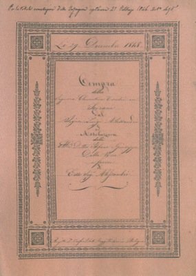 Bologna, 1848, 29 dicembre, rogito originale di 8 pp, in cartella con bella cornice xilografica, timbro a secco, timbro e firma del notaio Onofrio Pilati Baggi di Bologna
