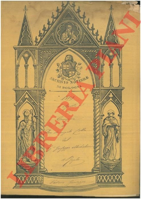 Bologna, 1819, agosto 6, rogito originale di 12 pp. in cartella con bella cornice xilografica, timbro a secco, firma del notaio Giuseppe Venturi di Bologna