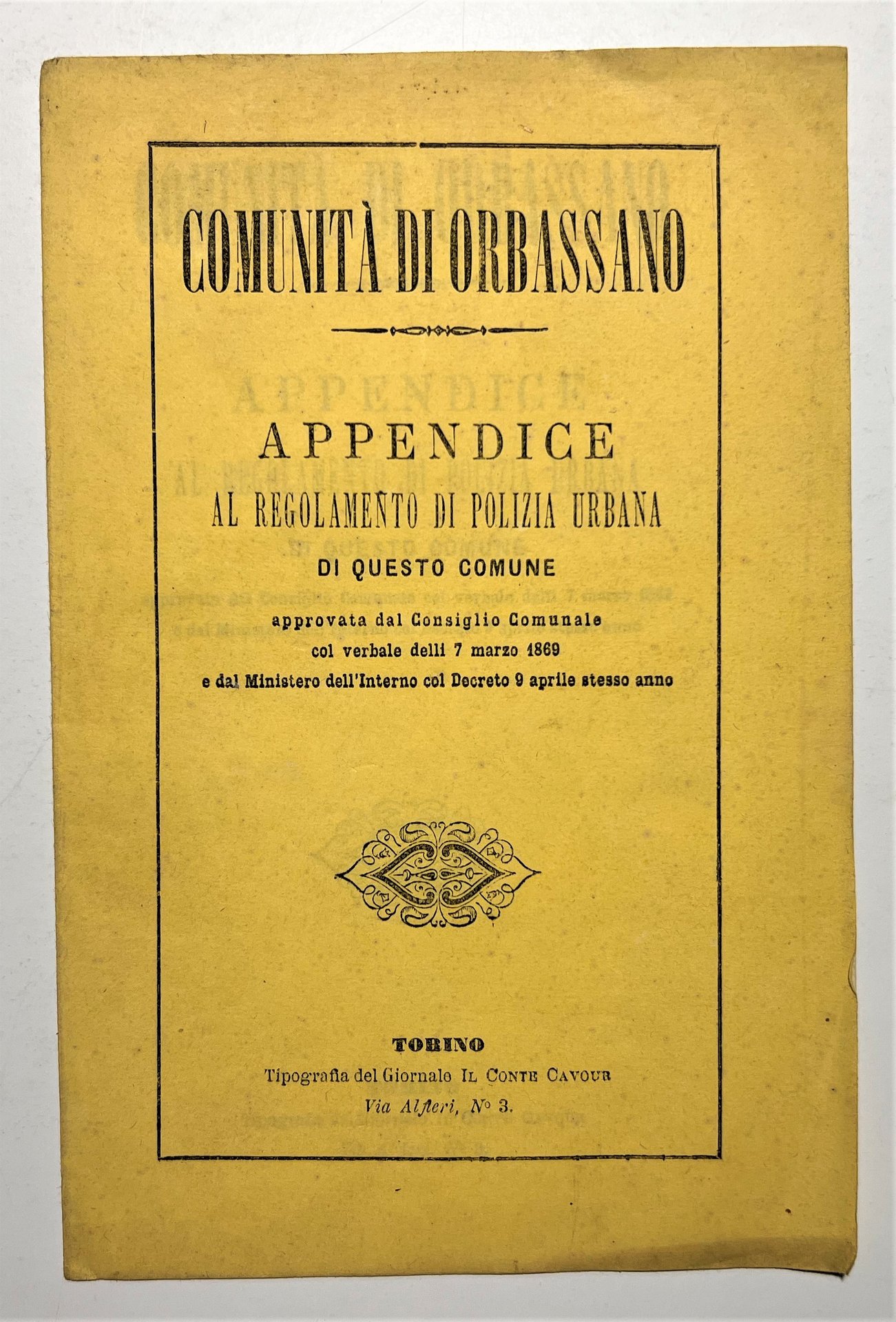 Comunità di Orbassano - Appendice al Regolamento di Polizia Urbana - ed. 1869 Testo in lingua italiana. Pagine 4 Copertina morbida. Condizioni buone con piccoli segni del tempo come da foto.