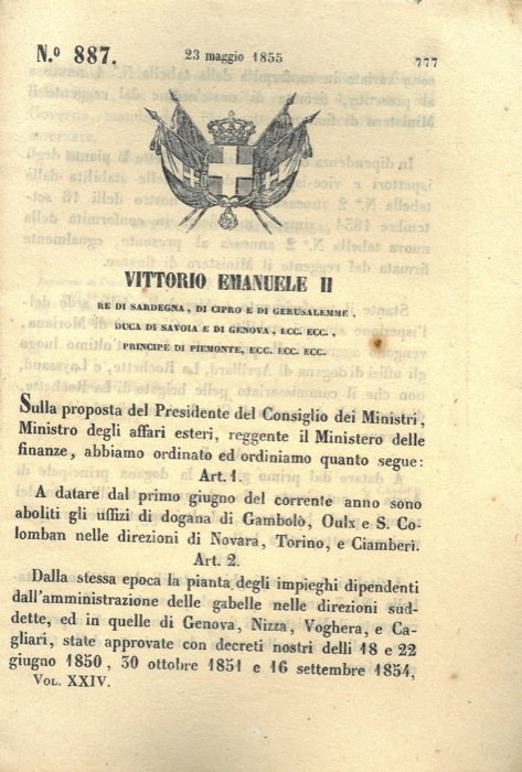 con cui si aboliscono dal 1 Giugno del 1855 gli uffici doganali nelle direzioni di Novara, Torino e Chambery.
