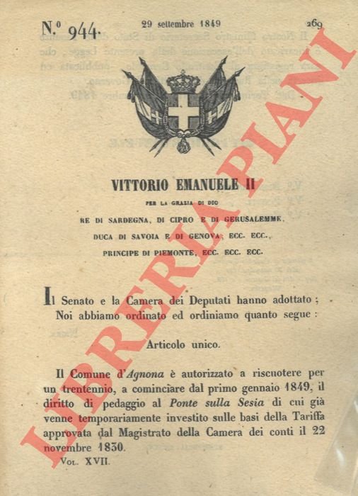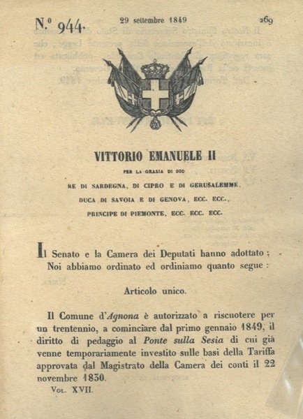 con cui si autorizza il comune di Agnona alla riscossione del diritto di pedaggio al Ponte sulla Sesia.
