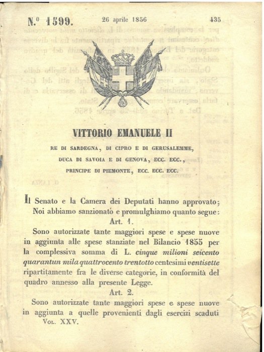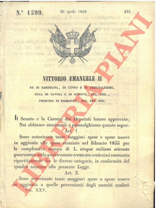 Torino, 1856, 26 Aprile, firma Vittorio Emanuele II, Lanza, stemma reale xil. pp. 2 + 3 pagg. con tab.